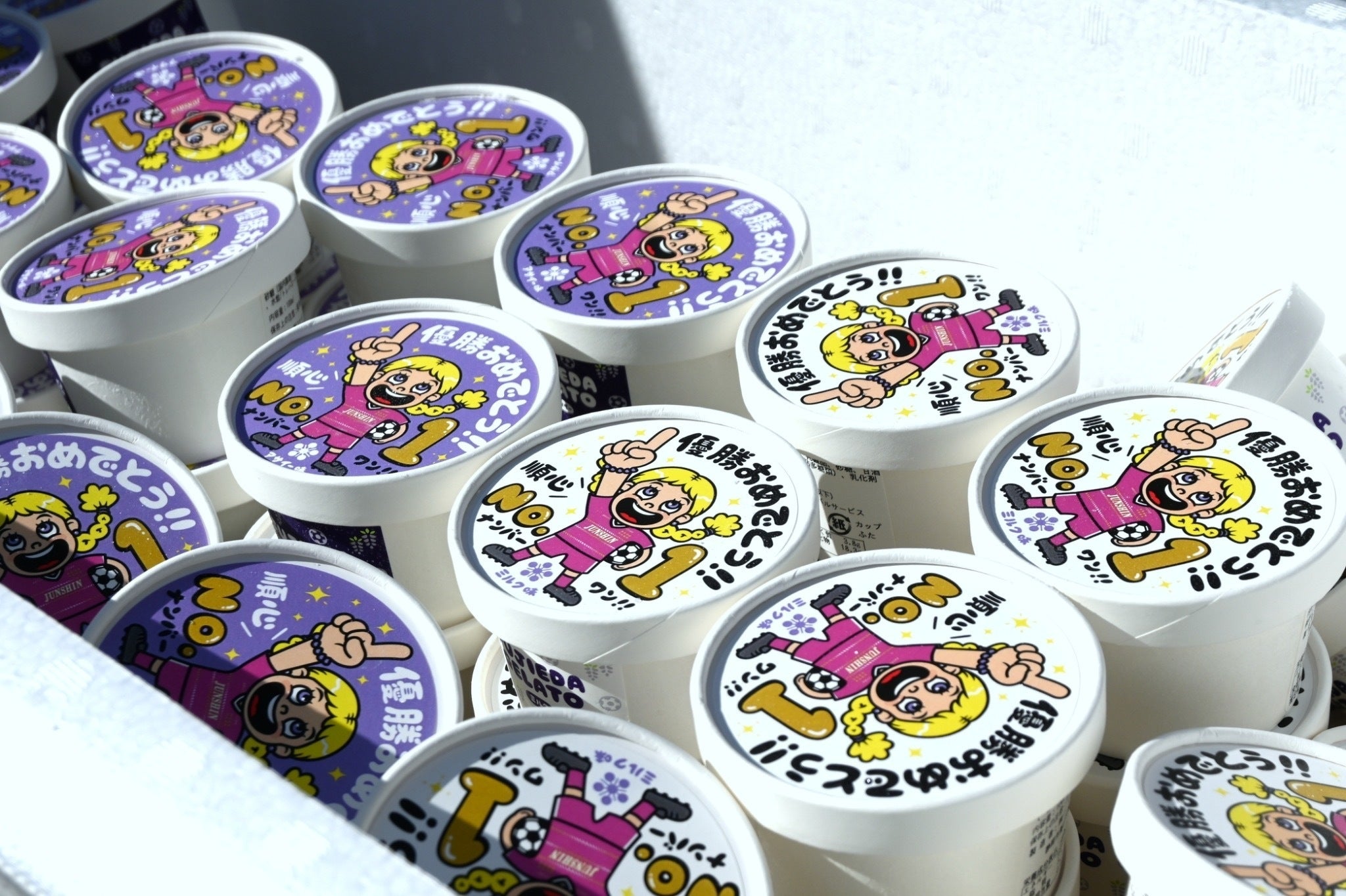 みなさんこんにちは!先日、藤枝順心高校グラウンドにて、『第32回全日本高等学校女子サッカー選手権大会』で見事2連覇を果たした藤枝順心高校サッカー部の皆さんに【藤枝ジェラート優勝記念特別ラベル】の贈呈をさせていただきました!当日は天気も良く動きやすい気温のなか、朝から学年対抗戦や、ゲーム大会などが行われていました。その最後に、【藤枝ジェラート】の贈呈をさせていただいたのですが、今回は特別ラベルということで、細部にまでこだわったデザインの紹介をさせていただきました。イラストレーターのICHIGENさんが、選手権から着用開始した新ユニフォームデザインを忠実に再現してくださり、左胸には今回の優勝で増えた8つ目の星もつけました。(選手権の時点ではユニフォームの星は7つなので、8つの星がついたユニフォームを最初に着用したのはテイラーちゃんになります。笑)選手はもちろんですが、保護者の方々も大変喜んでくださり、急遽ではありましたが贈呈できて本当に良かったです!!選手の笑顔が眩しいですね^^☆プロジェクトチームのメンバーにも感謝を伝えたいです。ご協力いただきありがとうございましたm(__)m本当にたくさんの方に支えられ、活動できています。今後も常に感謝の気持ちを忘れず、活動を続けていきたいと思います!今後も是非、ご注目ください!!
