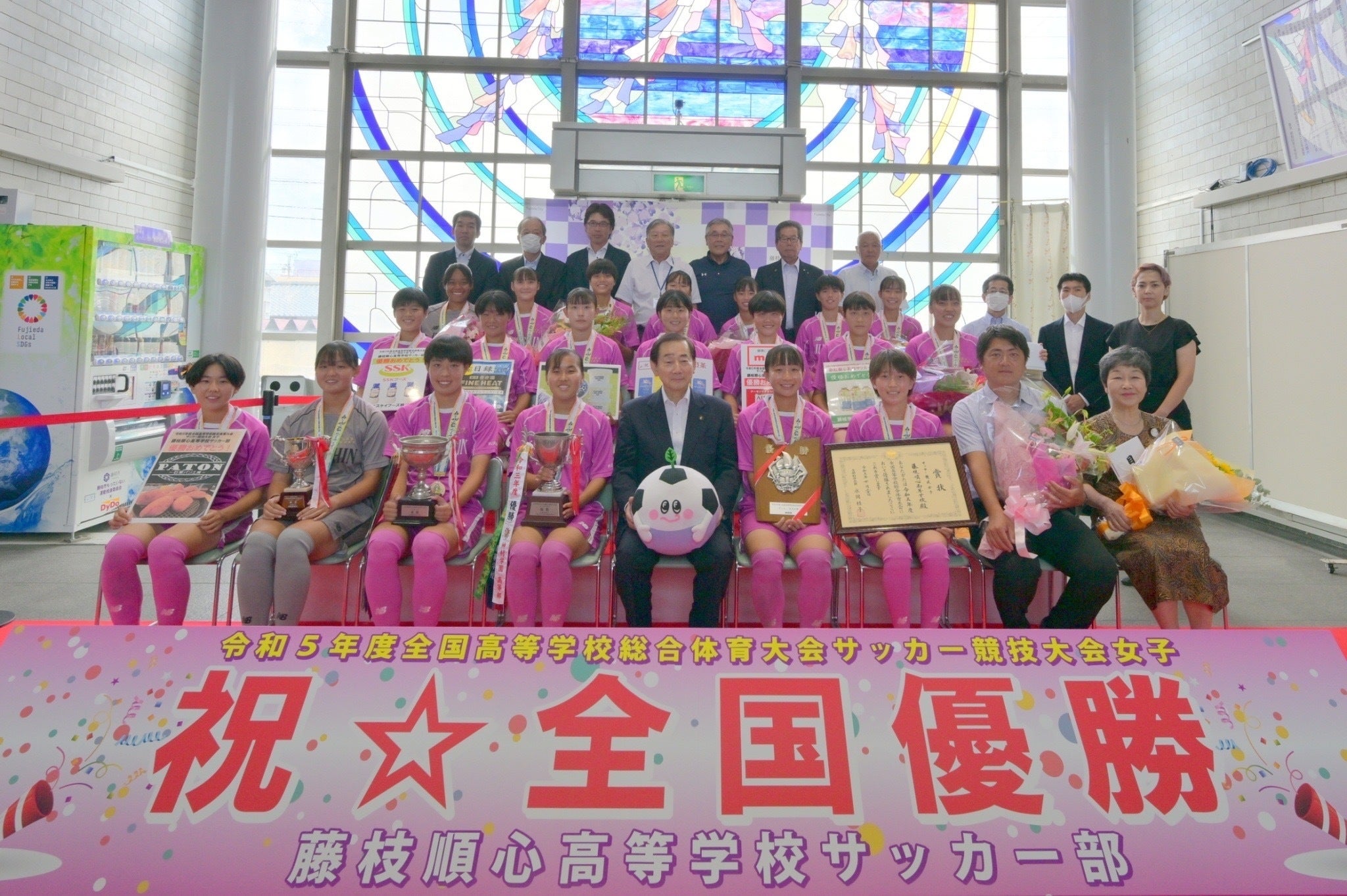 みなさんこんにちは!本日、藤枝市役所にて行われた『藤枝順心高等学校サッカー部 優勝報告会』に、株式会社ベース 齊藤氏が来賓として出席しました!(2列目右端)今日は目録でしたが、後日、直接選手たちに【藤枝ジェラート】を贈呈します!偉大な後輩たちに、ご褒美デザートをプレゼントできること、今から楽しみで仕方ないです!高校総体で2度目の優勝。選手権も合わせると7回目の全国制覇。簡単なことじゃないです。当たり前じゃないです。日頃どんなに厳しいトレーニングをしているのか、、私(順心OG)も多少は想像できます。体力面だけでなくメンタル面でも苦しい瞬間が沢山あります。高校時代は特に。それでもそこを乗り越え、日本一を勝ち取った選手達を誇りに思います!【藤枝ジェラート】が少しでも、次のチャレンジへ向かう選手達のパワーになれたら嬉しいです!また贈呈式の様子を報告させていただきます!お楽しみに^_^