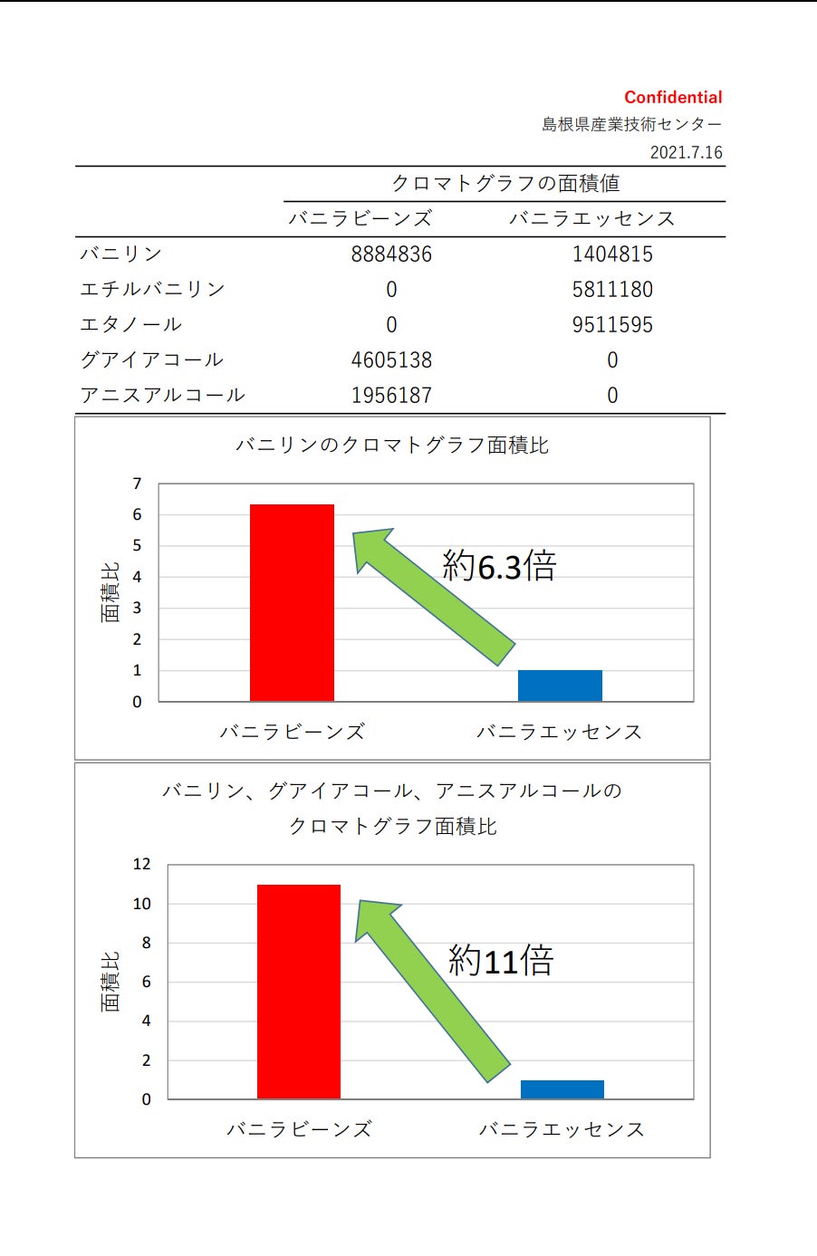 バニラの香気成分分析を浜田市にある島根県産業技術センターにて実施しました。実験方法はGCMS(ガスクロマトグラフ質量分析装置)で測定。結果、バニラの主要香気成分のバニリンのクロマトグラフ面積比は市販のバニラエッセンスに比べ約6.3倍、バニリン、グアイアコール、アニスアルコールを含めたクロマトグラフ面積比は約11倍という数値が出ました。