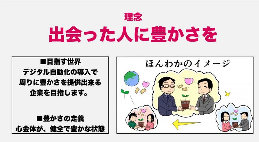 理念として大切にしているのは、「出会った人に豊かさを」という想いです。これは私自身が脱サラする前、副業の活動を通じて、世の中には自分の売上のみを考える人と、周りに喜ばれながら理想を実現するために活動する人がいることを知り、後者になりたいと強く感じたからです。