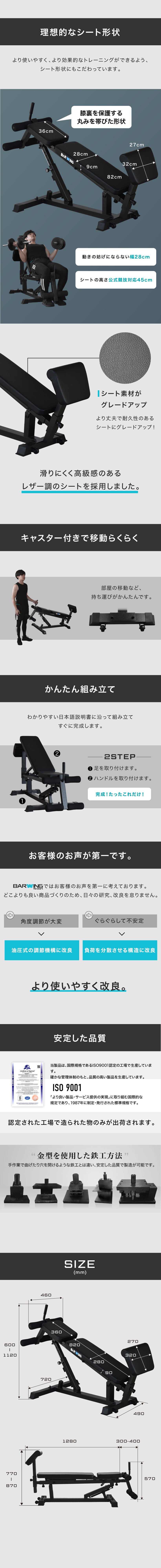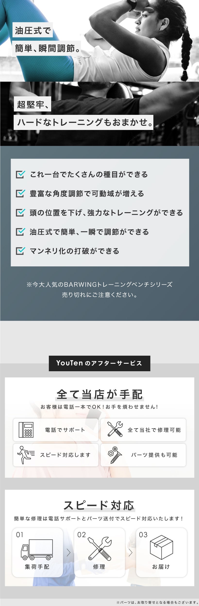 ● 本製品は家庭用のトレーニング器具です。学校やスポーツジム・業務用など、不特定多数の方による使用はしないでください。また、運動以外の目的では使用しないでください。● 下記にあてはまる方は必ず医師へご相談の上、使用してください。医師へご相談できない方は使用しないでください。・身体の不自由な方やご高齢の方、妊娠中の方・心臓疾患、脳血管障害、呼吸器系疾患、その他 安静にする必要がある方 ・医師の診断で運動を止められている方 ・発熱や過労などにより体調が優れない方 ・医師の治療を受けている方や、上記以外に特に身体の異常を感じている方 ● 小学生以下、及び一人での運動に不安を感じている方は、成人(健康な方)の方の介添えの上、ご使用ください。 また、小さなお子様やペットのいる場所でのトレーニングはおやめください。 ● 本製品の耐荷重は500kgです。ダンベル等のトレーニング器具と体重を合わせて500kgを超えない範囲でご使用く ださい。500kgを超えるご使用は器具の破損や重大な事故につながる恐れがございますのでおやめください。 ● 本製品を高いところから落としたり、強い衝撃を加えないでください。怪我や故障の原因になります。● 同時に複数人での使用はおやめください。破損やケガなどの原因となります。● 本製品は医療器具ではありません。医療行為には使用できません。 ● 本製品や体が周囲にぶつからないよう、予めスペースを確保した状態で使用してください。狭い場所で使用しますと事故やケガの原因になります。● ポケットに物は入れず、使用中に本製品への巻き込みを防止するため、ゆるみがなく運動に適した服装でご使用ください。 ● 医師から体を動かす事に制限をかけられている方は使用しないでください。また、体調が優れない方も使用しないでください。症状が悪化したり事故に繋がる場合がございます。 ● 次のような場所での使用および保管はおやめください。事故やケガ、故障の原因になります。◇ 乳幼児や小さなお子様の手の届く場所 ◇ ペットが触れられるような場所◇ 水の多い場所や水滴などがあたる場所 ◇ 高温、多湿の場所 ◇ 暖房器具の近くなど本体が高温になる場所◇ 直射日光が当たる場所◇ ほこりの多い場所・土や砂などがある場所・振動や衝撃の加わりやすい場所 ● 本製品に水をかけたり、浴室など湿度の高い場所、軒下や屋外などでは使用しないでください。● ご使用中にめまいや吐き気、痛みなど、身体に異常があらわれたり感じたりした場合は、直ちに使用を中止し 医師に相談してください。事故や体調不良を起こす原因になります。 ● 本製品の組み立て時やご使用になる時は、可動部分・部品等に手や指などを挟まないようご注意ください。 ● 怪我をする恐れがありますので、安全のため必ず軍手等を着用し、大人二人以上で行ってください。 ● 本製品をマニュアル通りに組み立て、ご使用いただかなかった場合、重大な事故を起こす恐れがありますので、絶対におやめください。 ● 組み立て・設置の際は十分な広さのある平坦な場所にて行い、周辺の家具や床を傷つけないよう行ってください。 ● ご使用前に必ずストレッチ・準備体操を行ってください。体をほぐさずにご使用いただいた場合、怪我をする恐れがあります。● 運動量は徐々に増やし、無理をしない範囲で行ってください。 ● 使用中および使用中以外でも本製品の隙間や可動部分に手や指を挟まないようご注意ください。 ● 身体に過度の負担をかける使用はおやめください。事故や体調不良の原因になります。● 使用中に、第三者が本体に触れることのないようにしてください。怪我や転倒の原因となります。 ● 本製品は、しっかりとした水平な床の上に設置し、使用中および、本体の組み立て・移動・保管の際にも必ずを床を保護できるマットなどを敷いてください。● 脚立や椅子等のトレーニング以外の目的でご使用ならないでください。 ● 使用中、手やお尻などが汗ばんで本体が濡れた際は使用を中断し、乾いたタオルなどで拭きとってから再度ご使用 ください。濡れたまま使用すると事故やケガ、転倒の原因になります。 ● 食後すぐの運動、運動後30分以内の食事はお控えください。また喫煙・飲食をしながらの運動は絶対に行わないでく ださい。 ● 小さなお子様が本製品の側で遊んだり、本製品を遊具として扱わないよう十分にご注意ください。● 長くご使用していただくために、定期的に乾いた布で埃などを拭き取ってください。● お手入れの際はアルコールや中性洗剤等はご使用にならないでください。 ● 製品を痛めますのでシンナー系や酸系の強い洗剤でのお手入れは絶対に行わないでください。