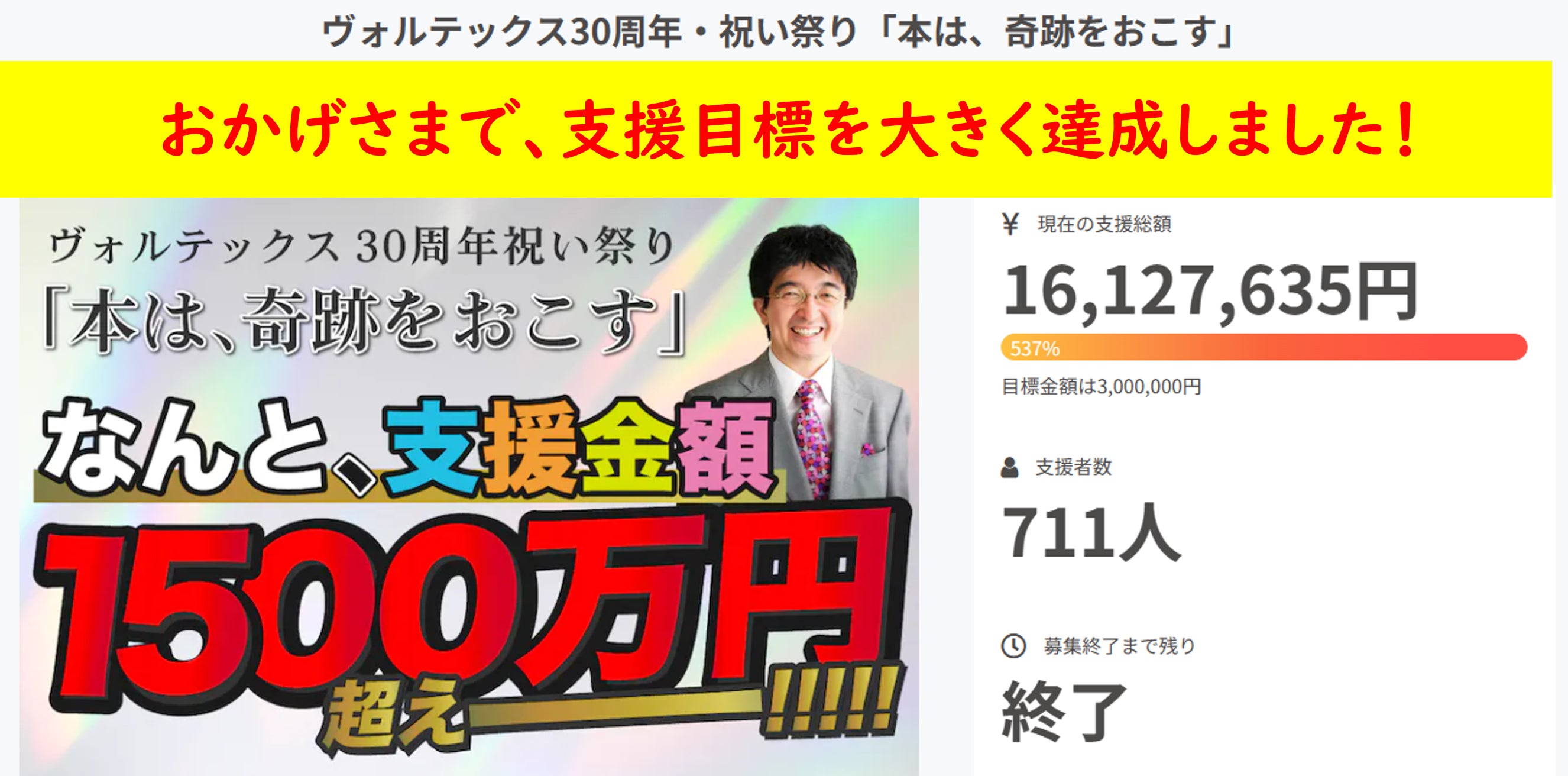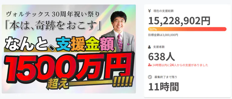 2023/09/27 11:50昨日9月26日(火)23:59をもちまして、2ヶ月間募集しておりましたヴォルテックス30周年・祝い祭り「本は、奇跡をおこす」が閉幕いたしました。その報告と感謝をお伝えさせていただきます。当初の目標金額3,000,000円を目指しておりましたところ最終的に【711名】のご支援者より【16,127,635円 】のご支援金をいただくことができました。当初の目標金額を【537%】上回るご支援をいただき主催者望月俊孝をはじめ運営スタッフ一同、心から感謝を申しあげます。支援につきましては、当初プロジェクトのお約束のとおりに30周年創立記念パーティ(11/6)やリターンの履行に活用してまして「感謝の循環」を実現してまいります。2ヶ月間、ご支援いただいた方お一人お一人の温かい言葉に望月も励まされ、次の30年間も新しいリーダーとともにみなさまの期待を上回る価値を提供していく所存です。本日よりすみやかにお約束したリターンの準備・履行にうつります。ご提供や進捗のご報告は個別にメールをさしあげます。最後になりますが、この2ヶ月間、本当にご支援ありがとうございました。 もっと見る