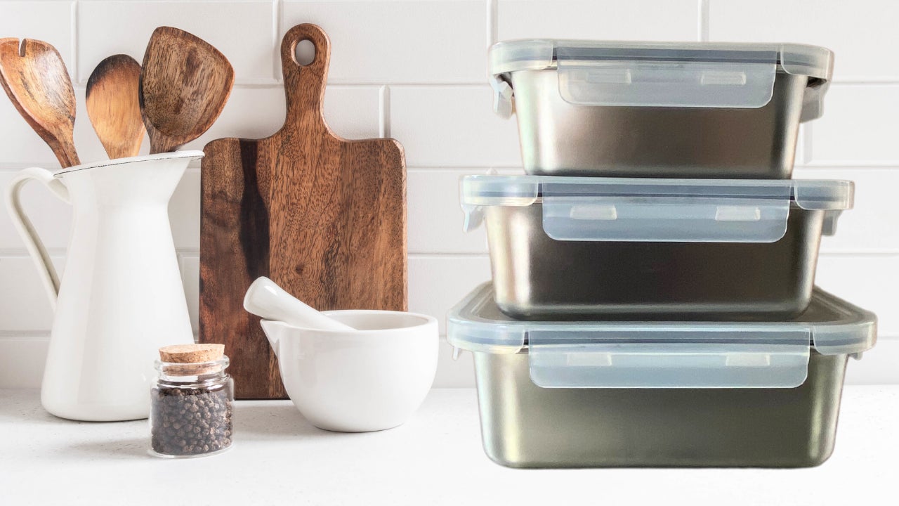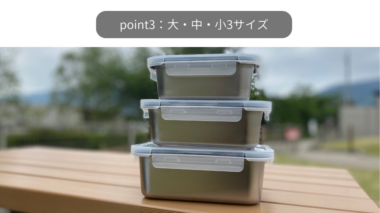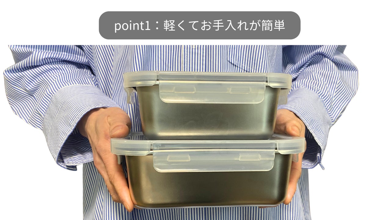 ステンレス素材の特徴は、熱や酸・アルカリに強く、におい移りや色移りもしにくく、汚れもおとしやすいため、衛生的な保存容器です。