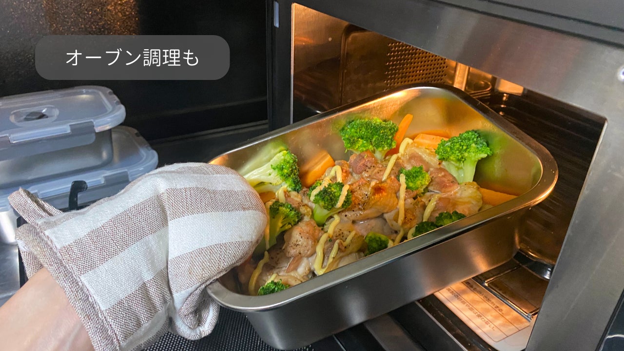 材料をレンジで下ごしらえした後にオーブン調理もこれ1つでOKです。