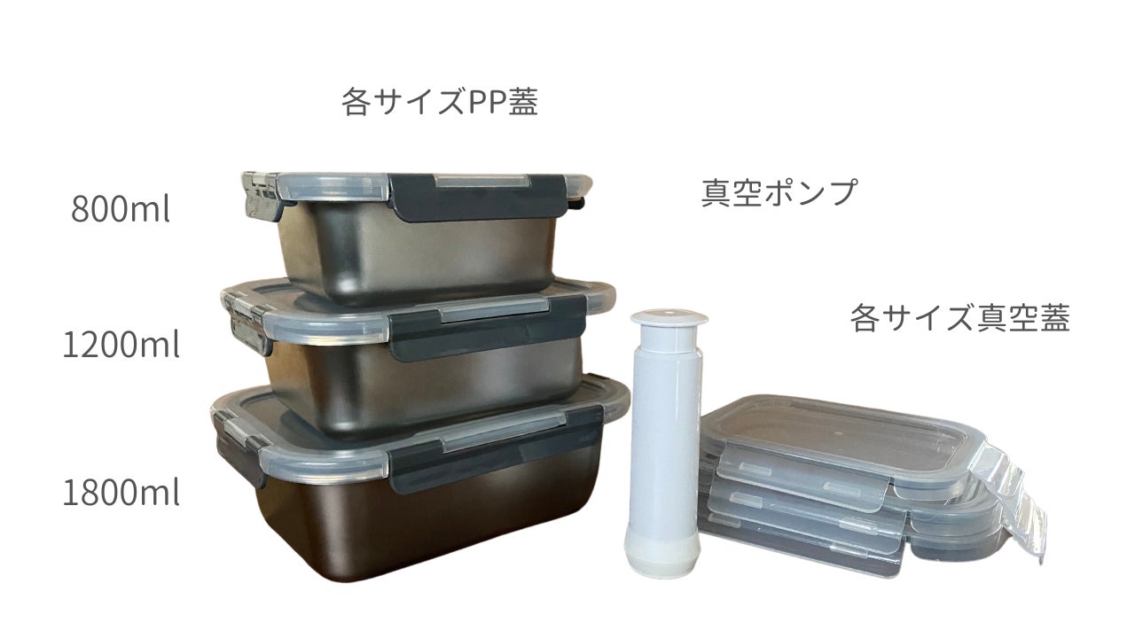 ■ 付属品:ステンレス容器小、中、大、PP蓋各サイズ×1、真空蓋各サイズ×1、真空ポンプ×1