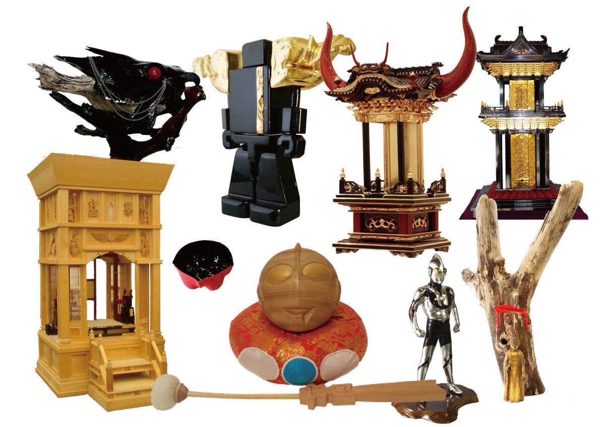 たった数十年という時間の経過で供養の世界の価値観が大きく変わり、日本の伝統的なモノづくりは崩壊してきています。もちろん仏壇が売れなくなれば職人の仕事もなくなります。生産本数が激減しはじめた頃、僕は仏壇の技術を他産業に転用させようと玩具会社とタイアップして漆フィギュアや特撮ヒーローとのコラボ製品などの企画、仏壇技術を使ったアート作品の提案などを実施してきました。