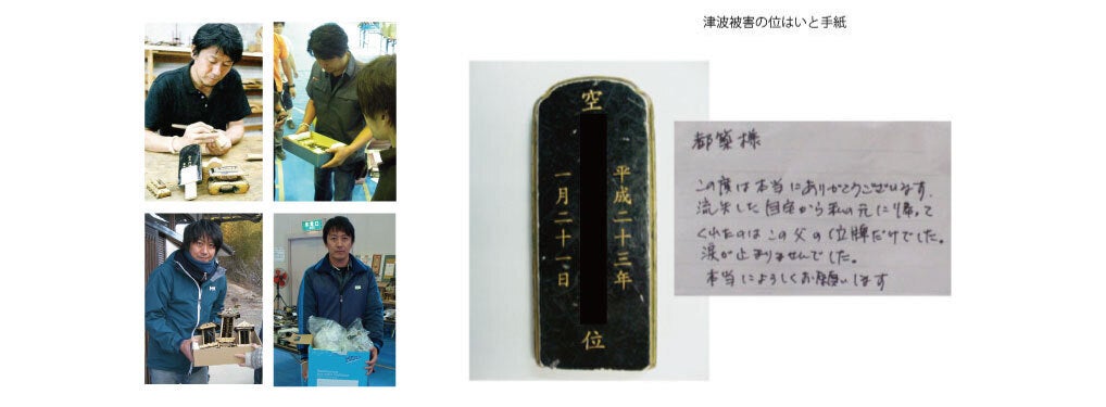 2011年の東日本大震災で僕が実施した津波被害の位牌修復ボランティアが大きな転換期となりました。今まで僕の発想は仏壇文化を守ることだったので、位牌についてはノーマークでした。位牌の大切さは知っていたつもりでいたのですが、被災位牌の修復を依頼いただく被災者の皆さんから聞く話は僕の考えの甘さを実感しました。「盆や正月に家族が帰ってくるのは家に先祖の位牌があるからだ」一番心に響いた言葉でした。仏壇とは大切な物を入れるだけの箱でしかなかったのだと気がつきました。仏壇と位牌を比べた時に、間違いなく位牌のが大切だったのです。いつか自分らしい位牌の形を提案したいと模索するようになりました。