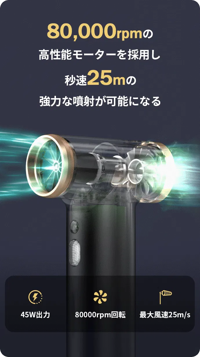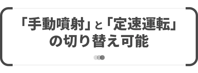 ボタンを押したときのみ噴射する「手動モード」と、ボタンを押さなくても連続噴射できる「定速運転モード」が搭載されています。起動後噴射ボタンを3秒長押しすると、「定速運転モード」に切り替わります。