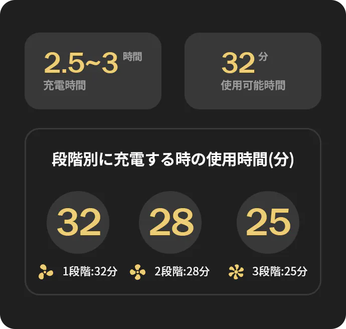 1000mAh大容量リチウムバッテリーが内蔵されているため、2.5時間のフル充電で32分の連続稼働が可能です。