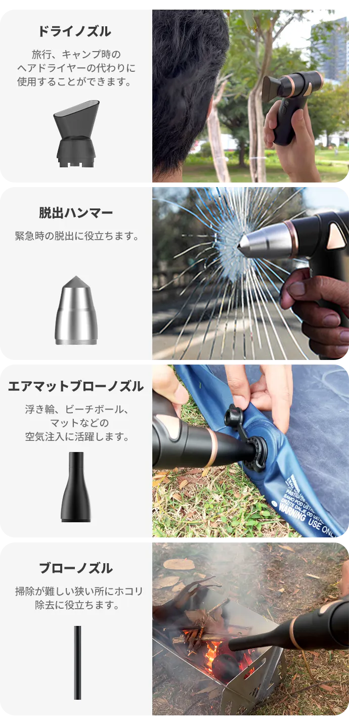 「 LS-089」とは強力な空気噴射で、ヘアドライヤー・エアダスター・空気入れ・空気抜き・火起こし送風機・扇風機・脱出ハンマー・LEDライトなど合計多様なシーンで活用できる8つの機能を持つインドア&アウトドア両用のエアダスターです。