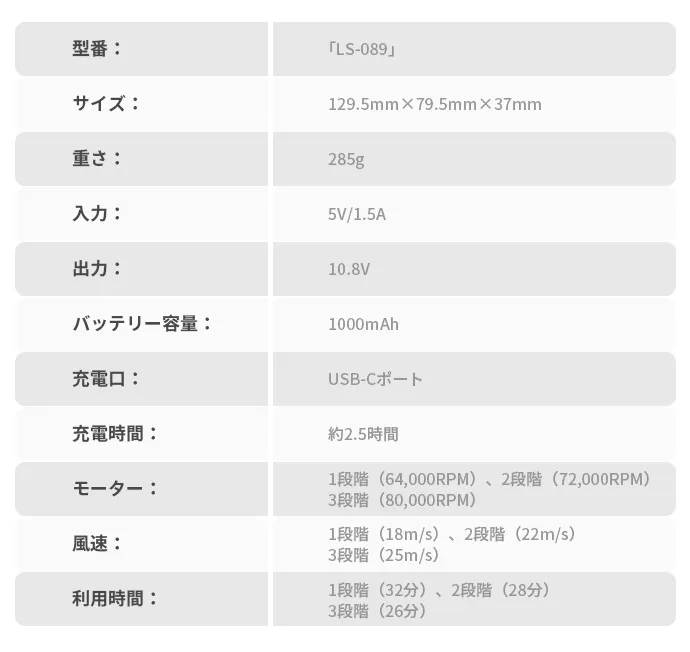今回おすすめする「LS-089」は、超コンパクトサイズですが、強力な風力を発揮してくれます。ヘアドライヤー・エアダスター・空気入れ・火起こし送風機・扇風機・LEDライトなど合計8つの機能を備えた上で、収納性と携帯性も抜群なので、家の中からアウトドアまで様々なシーンで大活躍します。