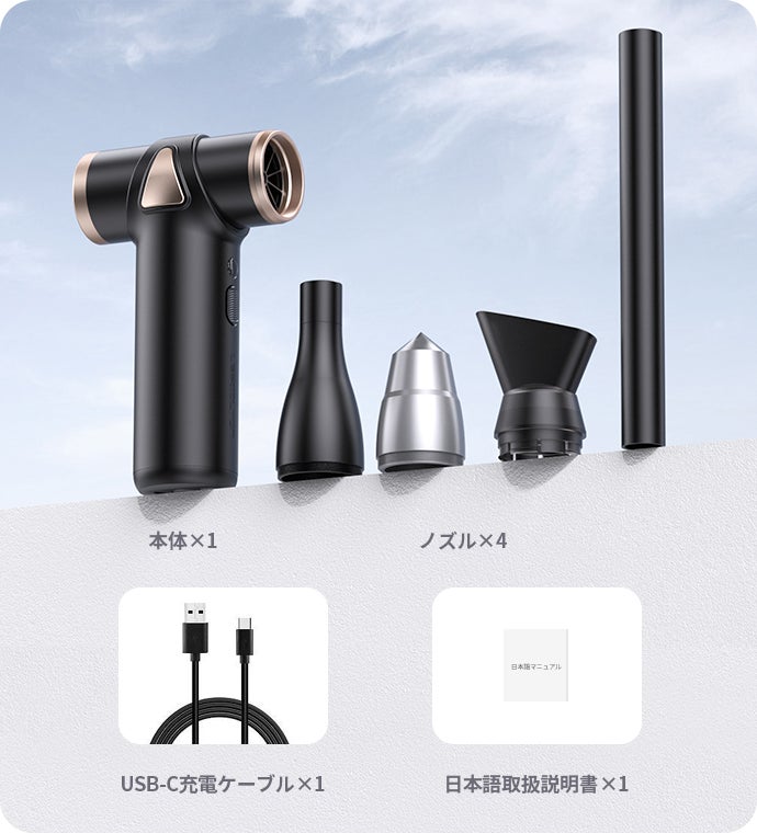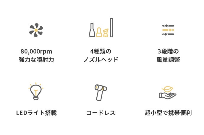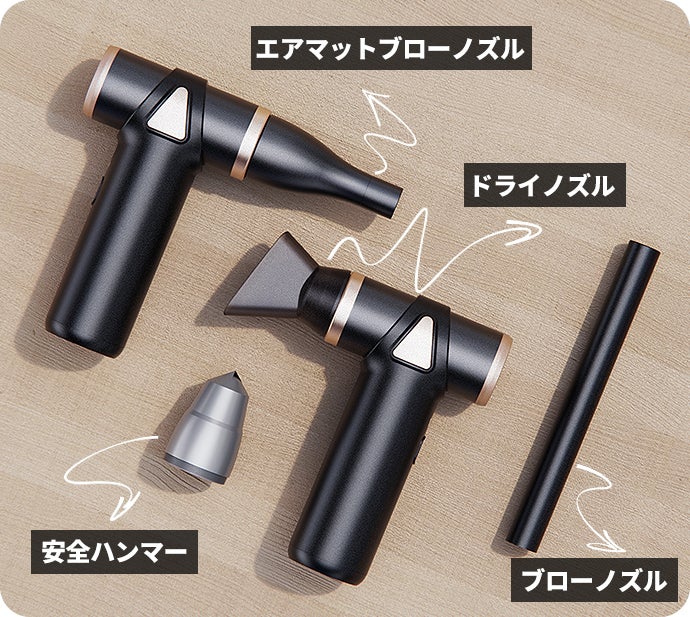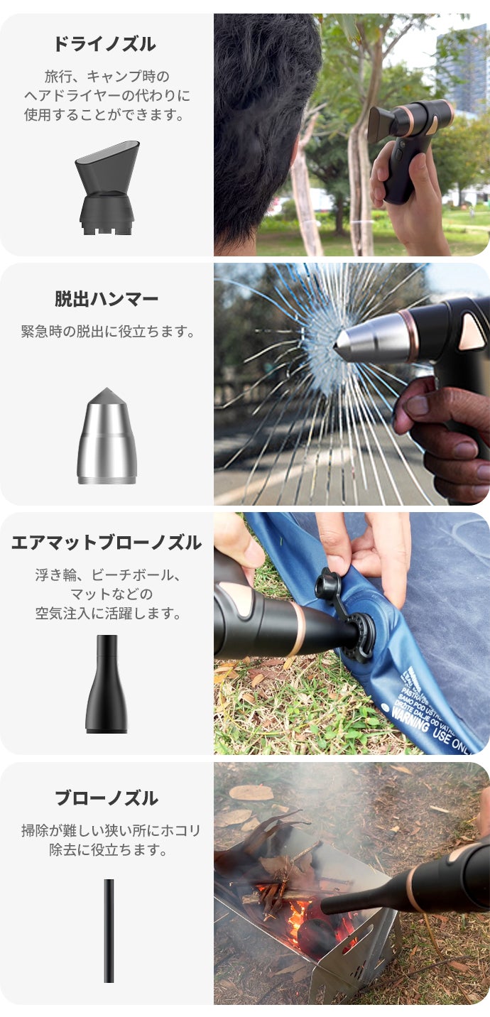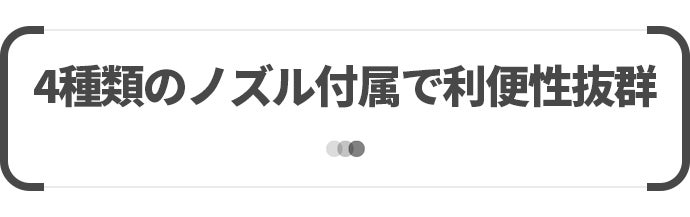 必要なシーンに合わせて取り付け可能な4種類のノズルが付属されています。家でもアウトドアでも活躍するので、常備しておくと大変便利な1台です。