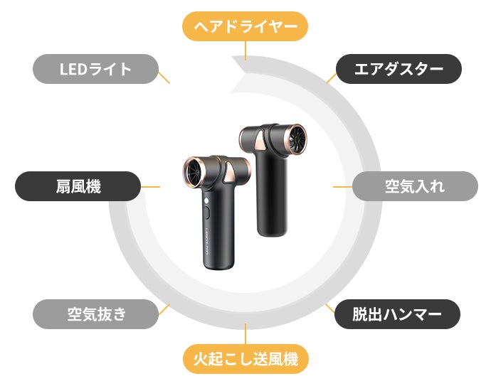 「 LS-089」とは強力な空気噴射で、ヘアドライヤー・エアダスター・空気入れ・空気抜き・火起こし送風機・扇風機・脱出ハンマー・LEDライトなど合計多様なシーンで活用できる8つの機能を持つインドア&アウトドア両用のエアダスターです。