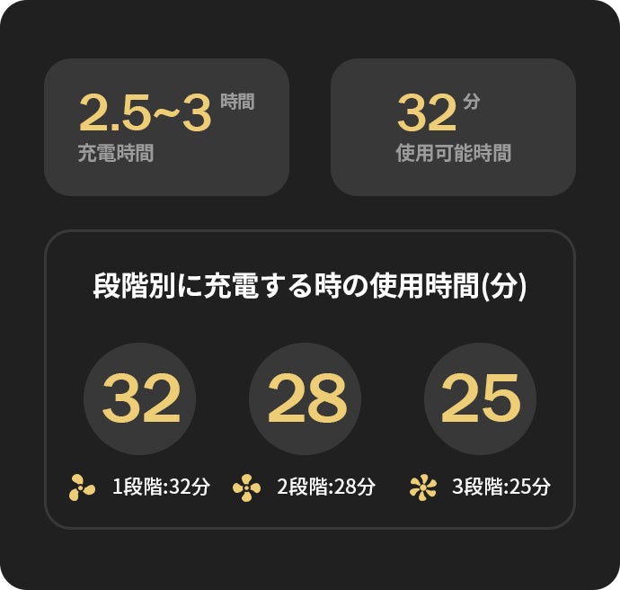 1000mAh大容量リチウムバッテリーが内蔵されているため、2.5時間のフル充電で32分の連続稼働が可能です。