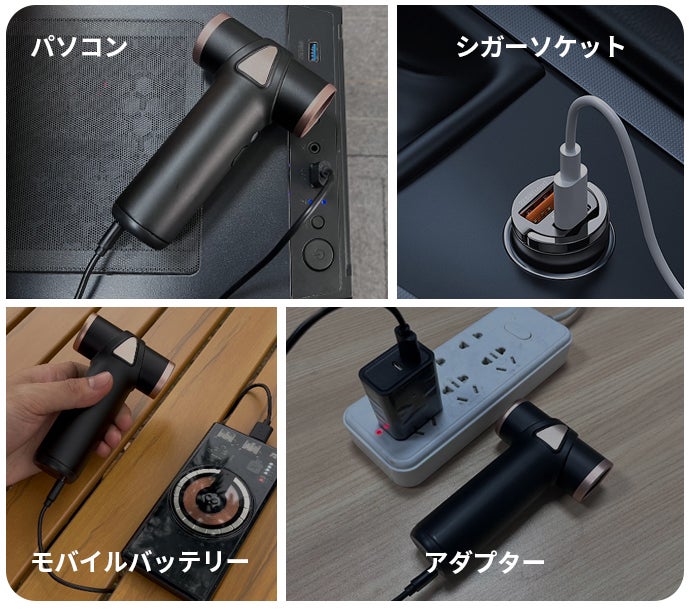USB充電に対応しているため、モバイルバッテリーやシガーソケット、パソコンなどから直接充電が可能です。いつでもどこでも使用できます!