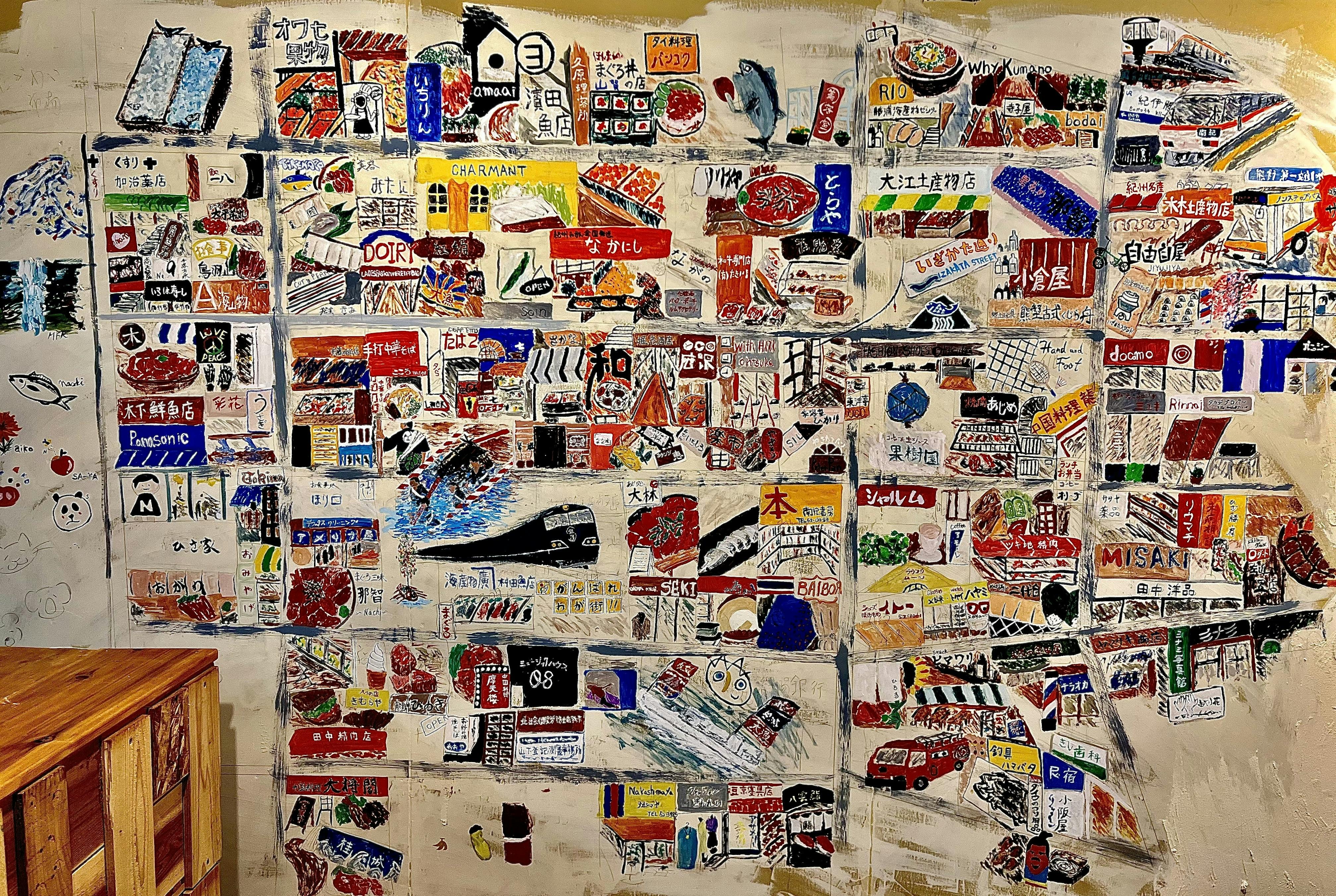 画像のスケッチですが、いざかたスタンドでは壁の一部に築地商店街を描いています。那智勝浦は観光地としては人気がありますが、ホテルと駅の往復のみで昔ながらの商店街などを散策する人が多くありません。せっかく那智勝浦に来たのだから、駅とホテルのみならず、地の場所にも足を運んでほしいという思いを込めて描きました。ぜひ一度覗きに来てみてください。