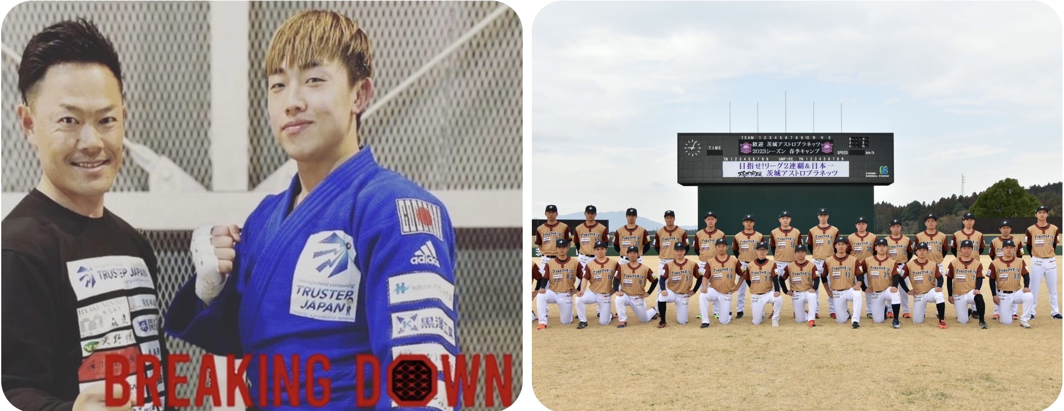 下記写真は「BREAKING DOWN」に出場している朝倉未来選手の弟子である安井飛馬選手のメインスポンサーをしていた時の写真と、BCリーグ「茨城アストロプラネッツ」の選手の皆さんとの写真です