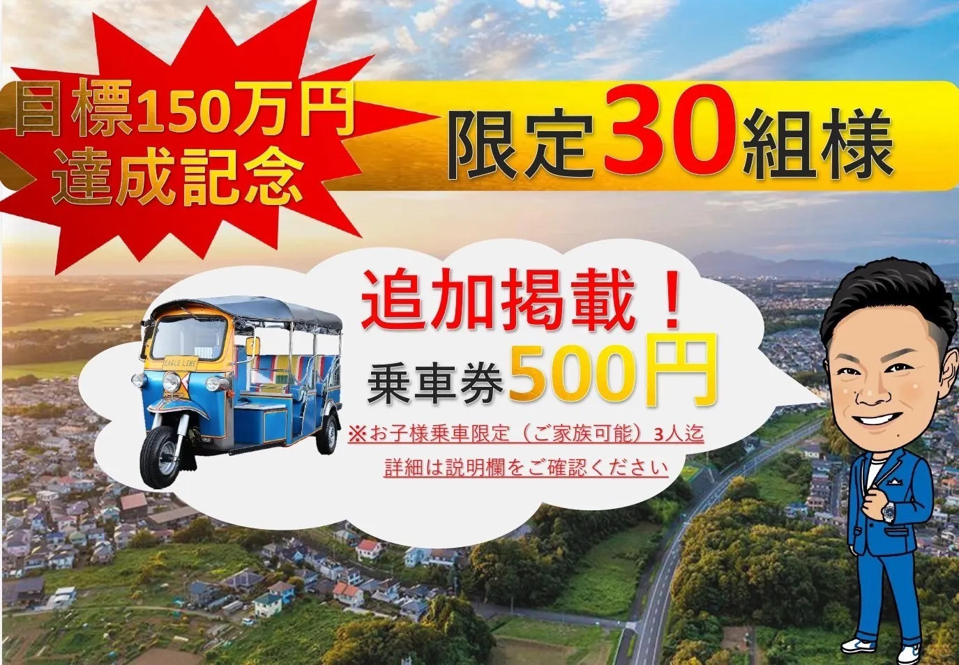 目標150万円達成記念、トゥクトゥク5分間乗れる券、乗車1回券