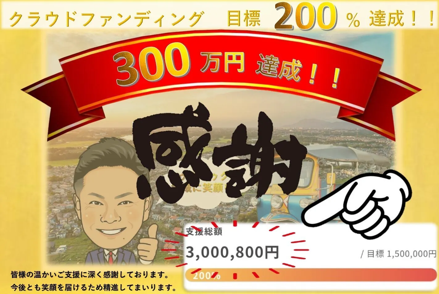 クラウドファンディング『トゥクトゥク導入で子供達と地域に最高の笑顔をお届け』の皆様から頂いたご支援総額が3,000,000円を突破いたしました!