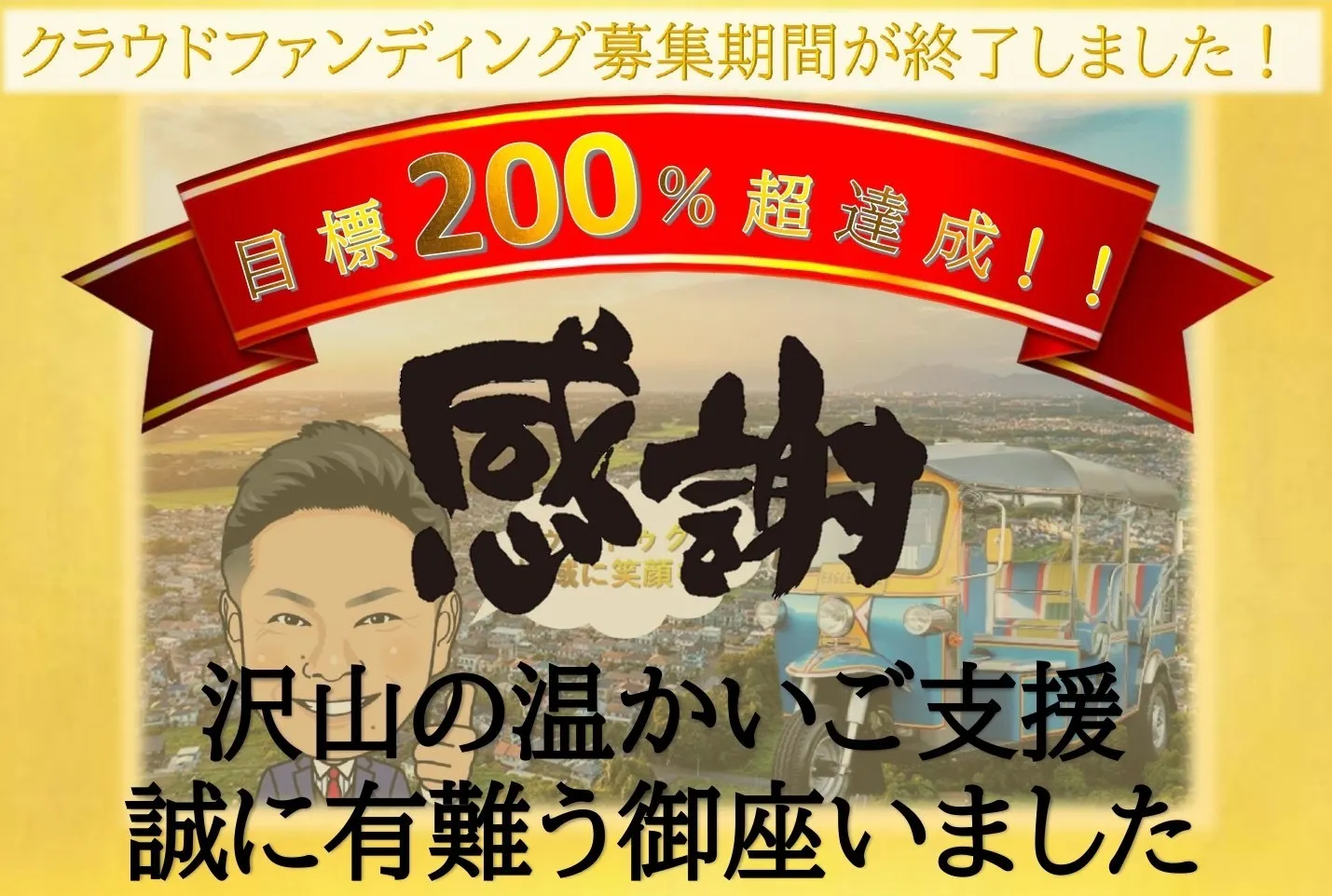 クラウドファンディング『トゥクトゥク導入で子供達と地域に最高の笑顔をお届け』の募集期間が終了いたしました。
