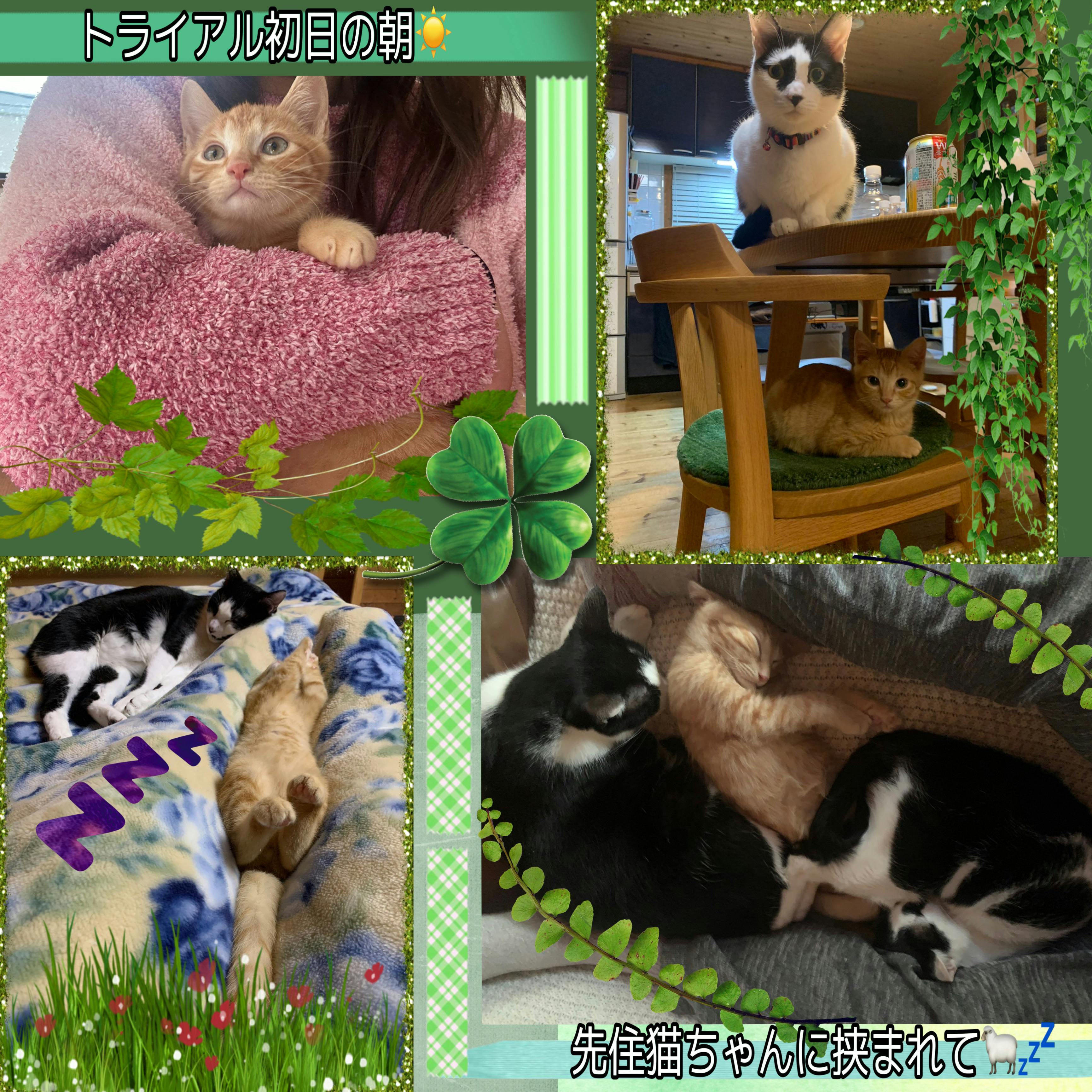 トライアル初日先住猫ちゃん達の威嚇具合に不安な気持ちも正直ありましたがあの威嚇はなんだったんだと言うくらい数日で受け入れてくれた様でお布団の上で一緒に寝ていますとお写真いただきびっくり!(笑)
