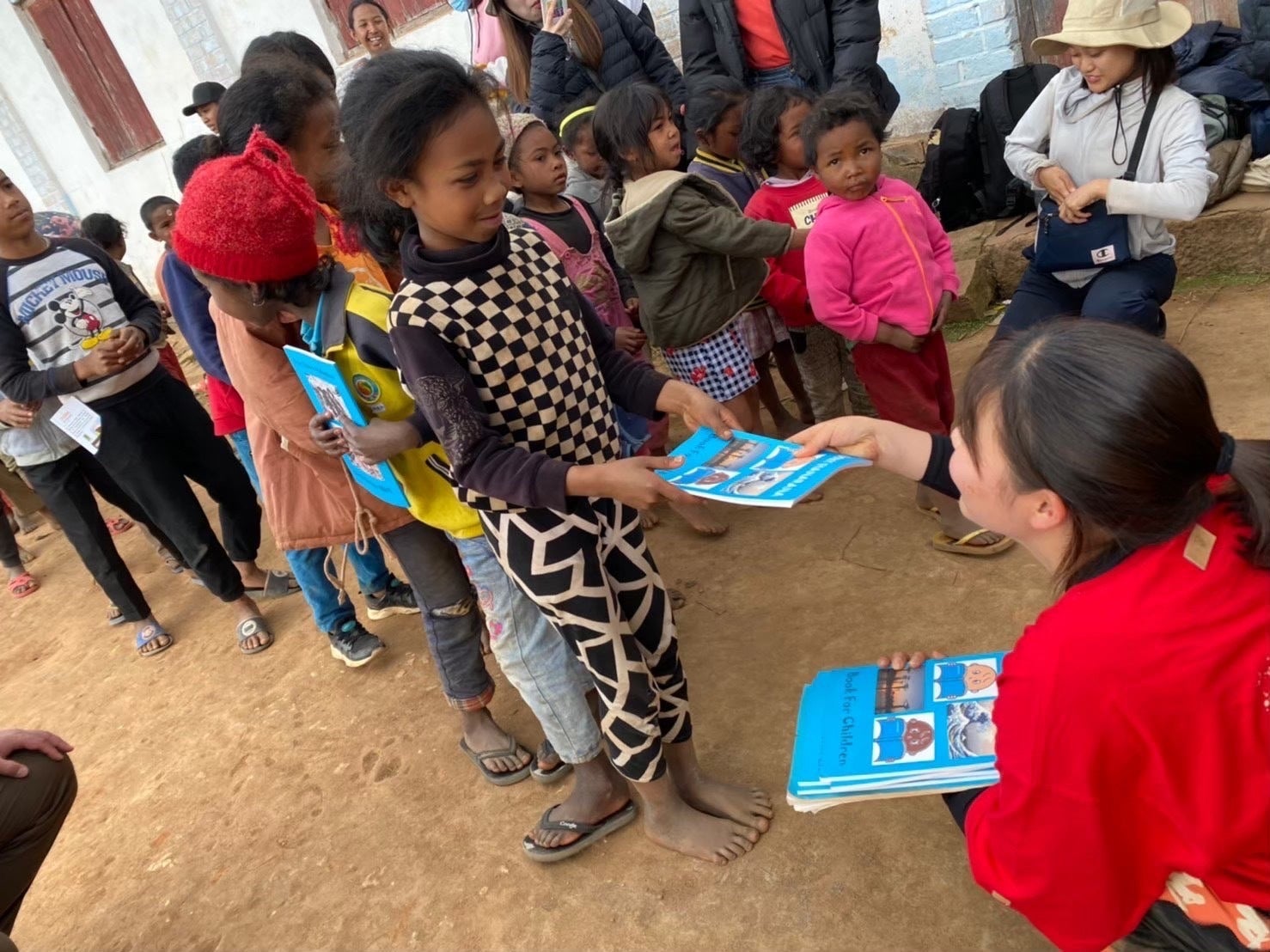 本研究会が作成した教科書をマダガスカルの子どもたちに渡している様子