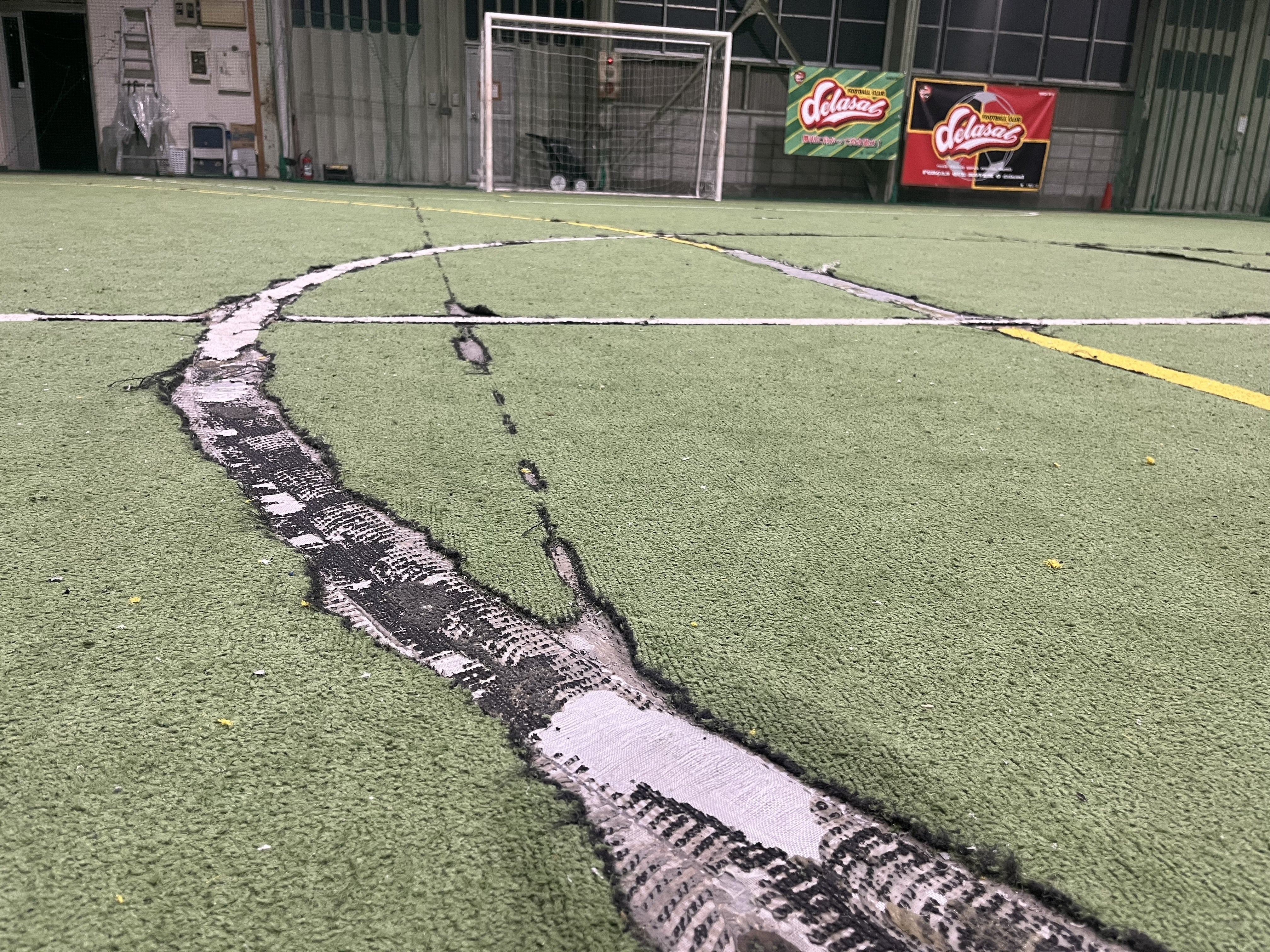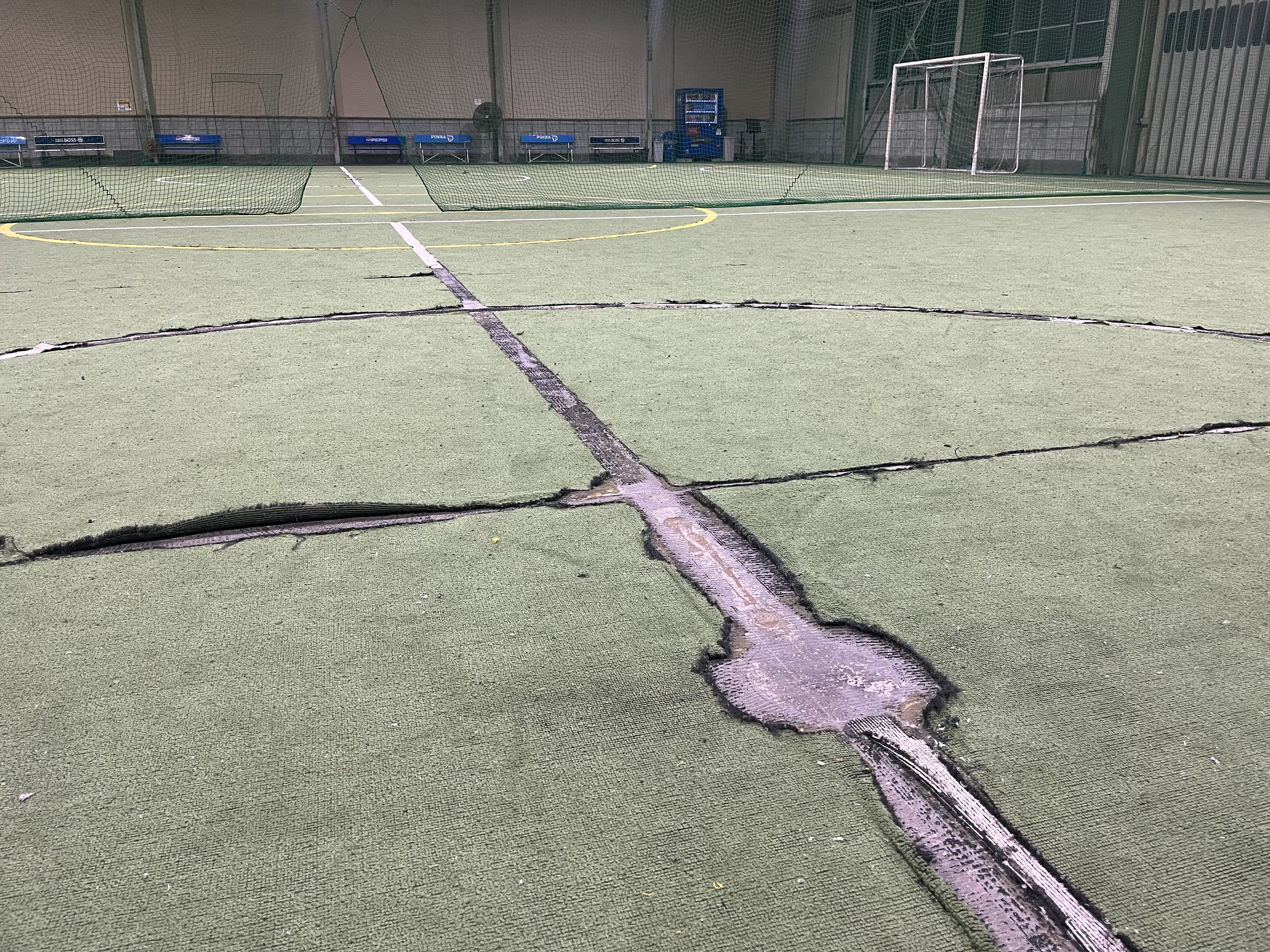 ただ、長年の施設老朽化により、人工芝の衝撃吸収、安定性が著しく低下し、非常に危険な状態にあります。