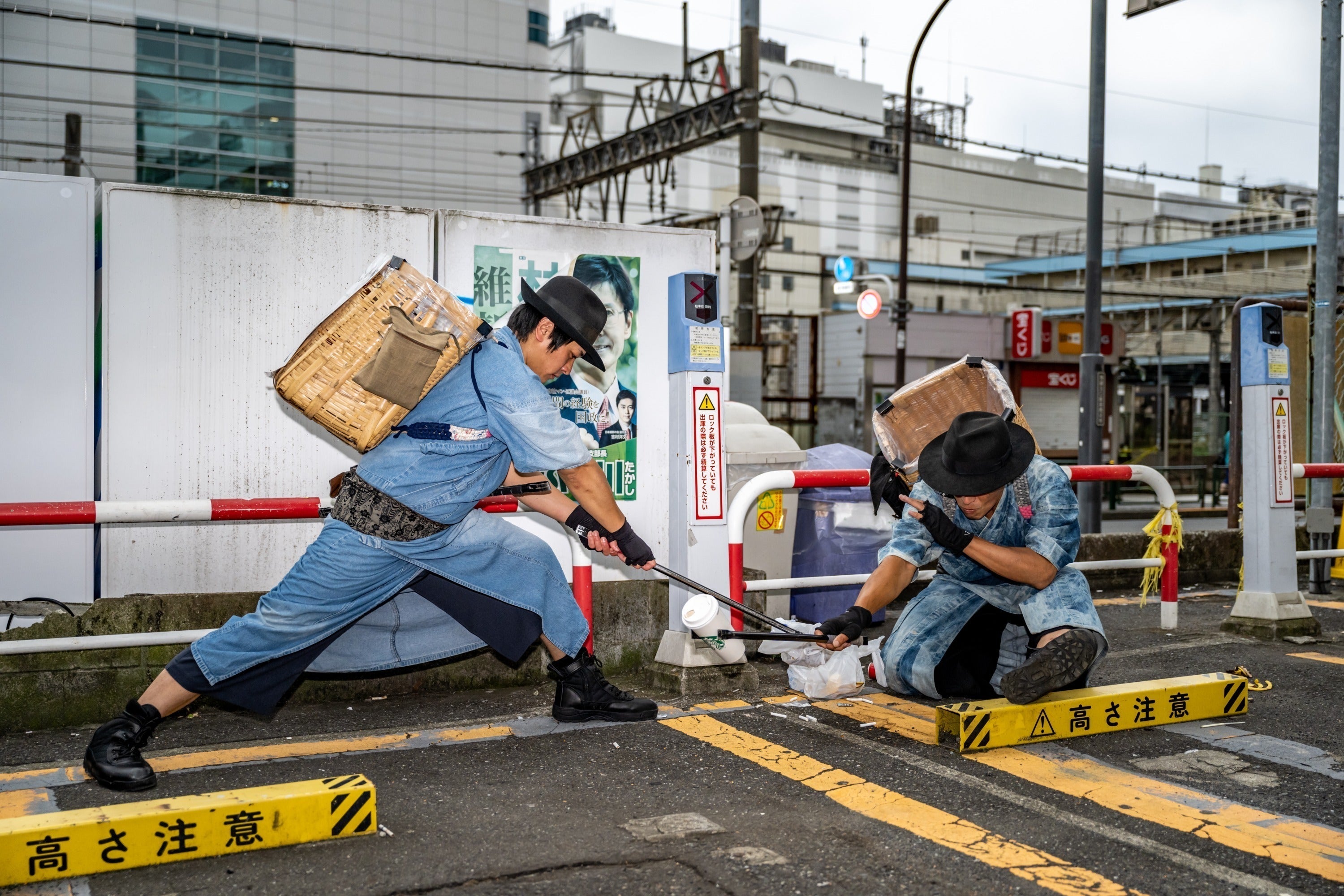 わたしたちは、デニムの着物を纏(まと)い、火ばさみを刀に見立て、