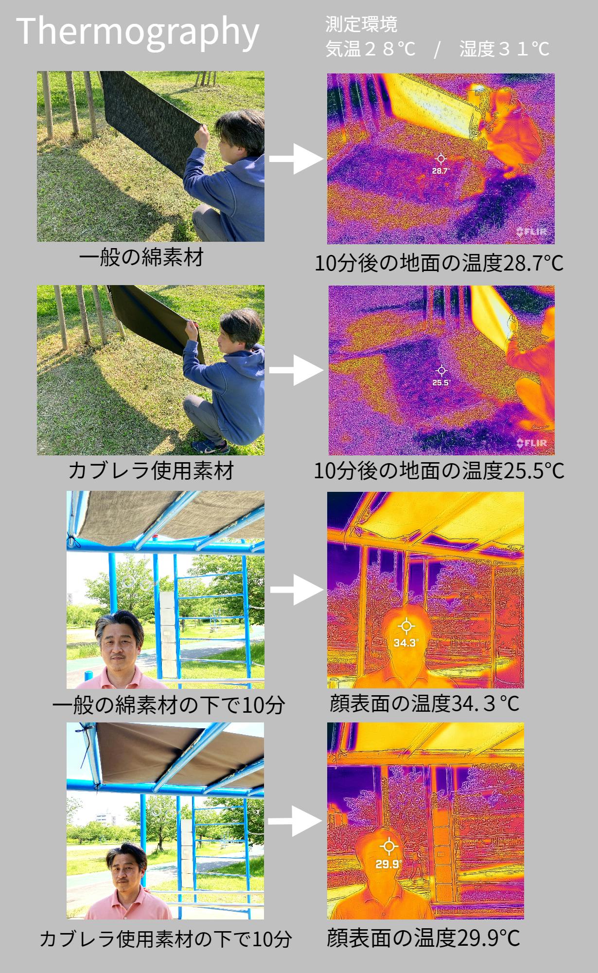 遮熱効果にも優れた素材(-4℃~-7℃)を使用しているので、日差しの強い日の暑さ対策にも最適! *生地の状態での試験結果になります。