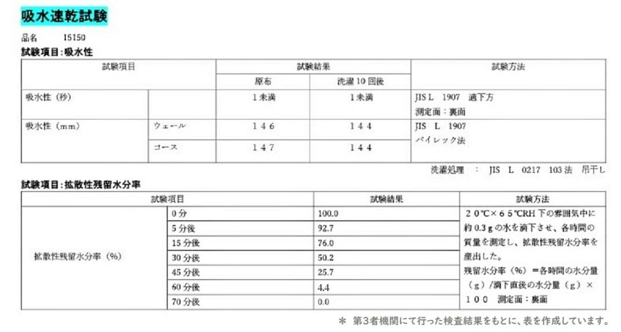 *第三者機関による検査結果:生地の状態での検査結果となります。