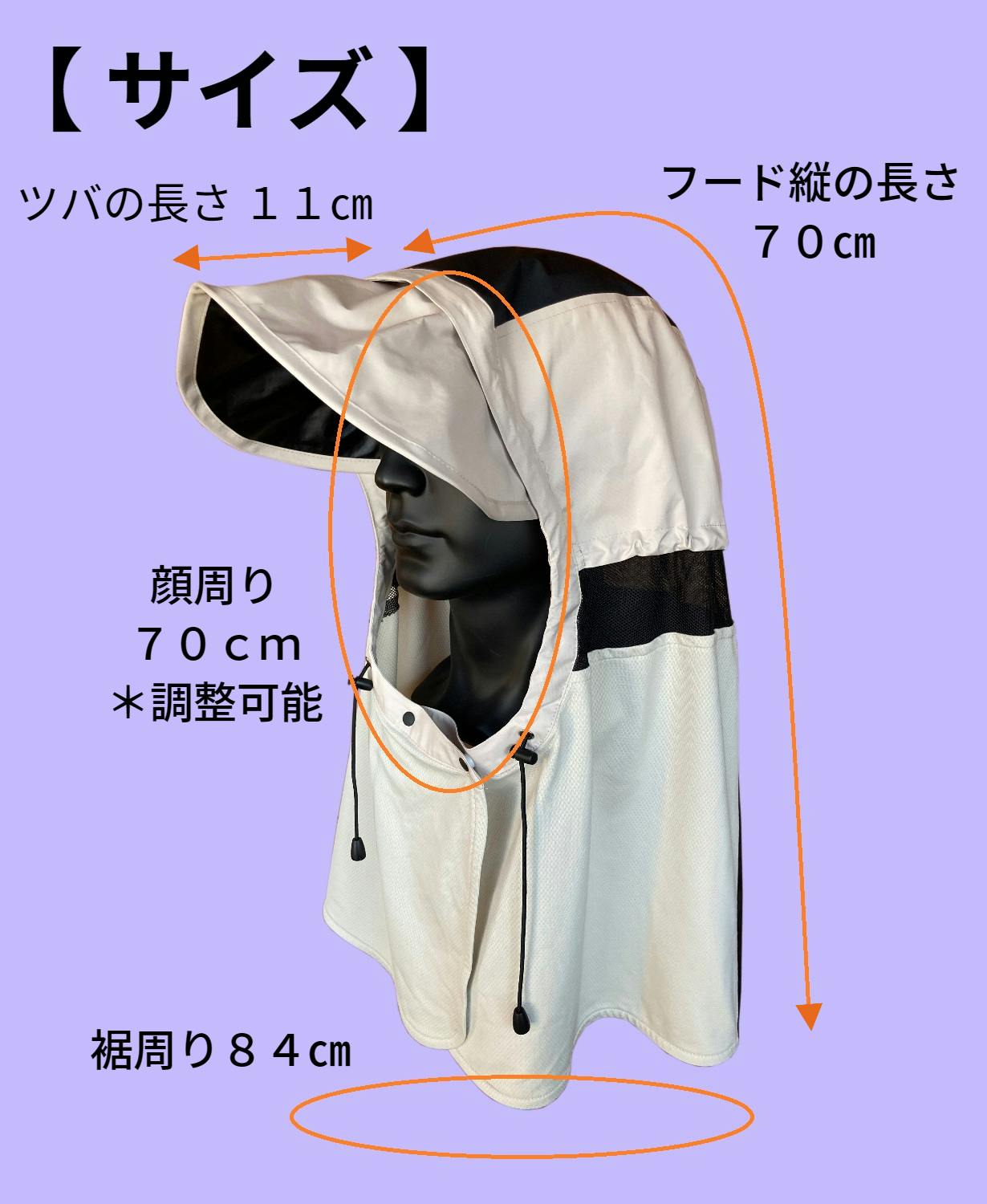 フードの後部にあるストッパーを締めることでサイズ調整ができるので、ズレたり風で飛ばされるのを防ぎます。