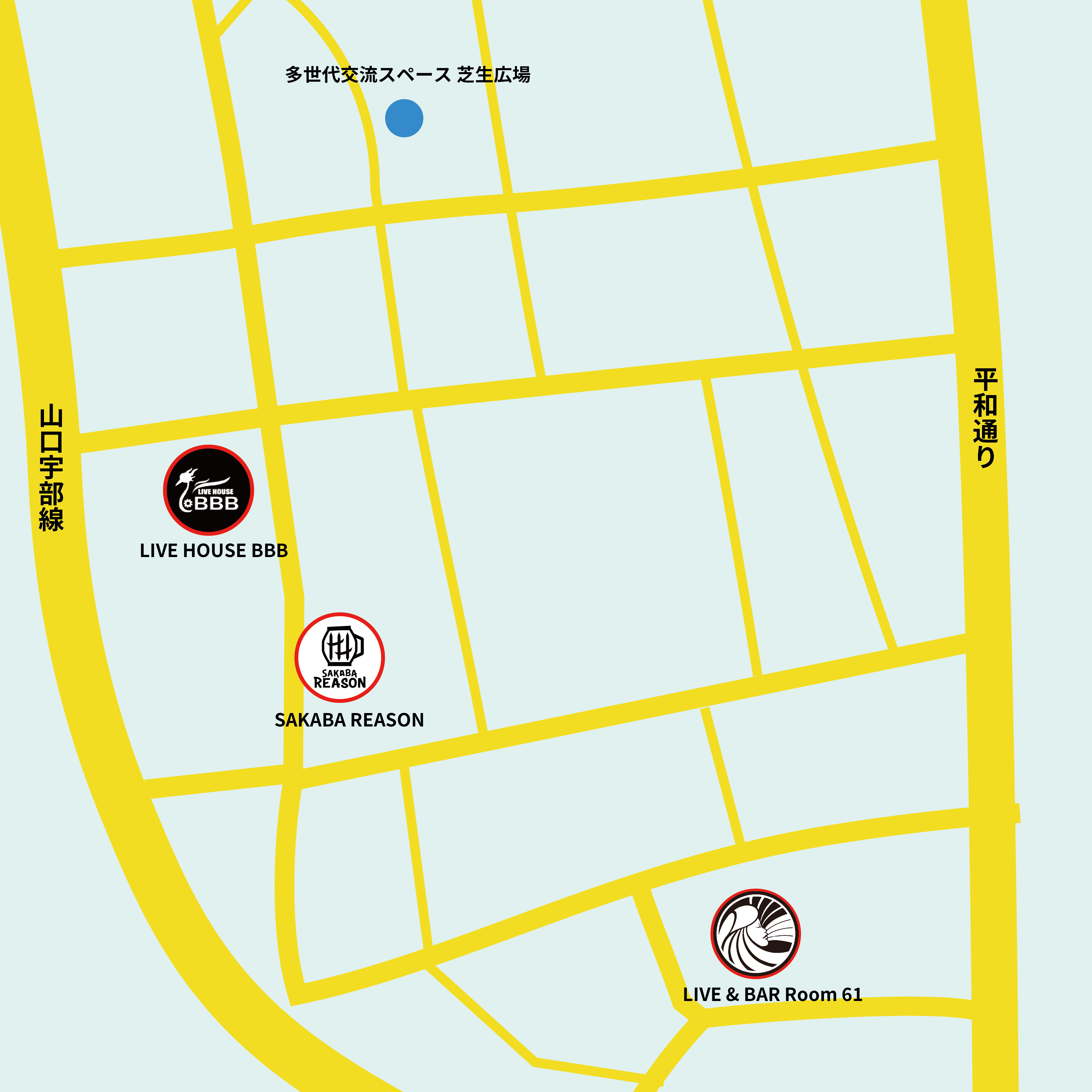 自身が勤める「LIVE HOUSE BBB」、日頃から沢山お世話になっている「LIVE&BAR Room61」の2会場と、更に「多世代交流スペース しばふ広場」を有効に活用して