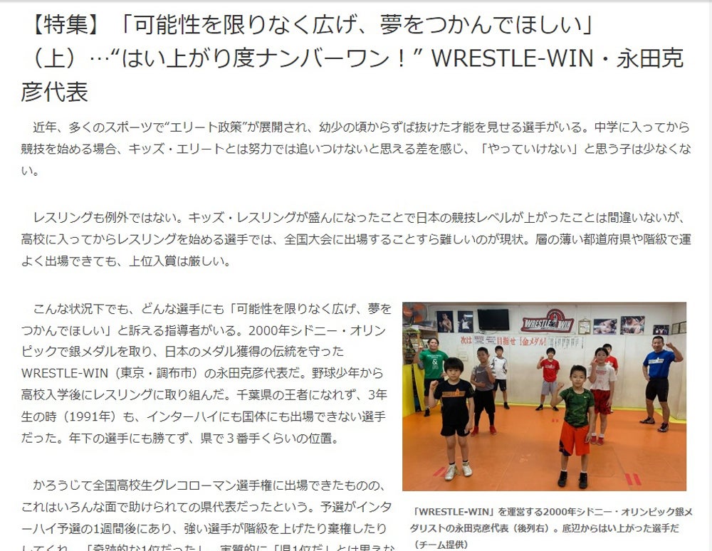 下記は、日本レスリング界のオリンピックのメダル獲得の伝統を守った永田克彦選手(現キッズ・レスリングクラブ「WRESTLE-WIN」代表)の「はい上がりストーリー」です。結果などからだけでは読み取れないドラマを伝えることが、その競技の発展につながるのです。