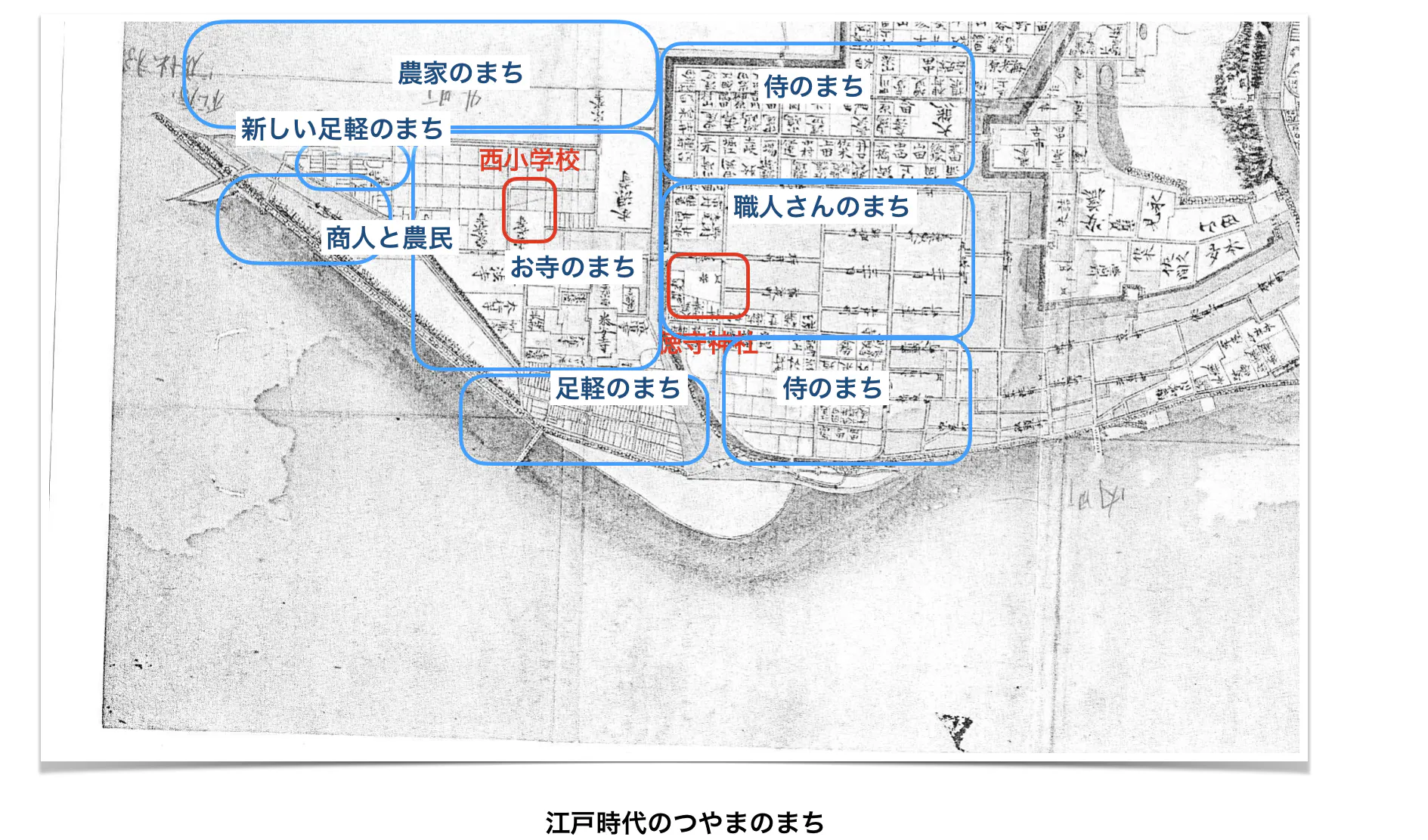 城下町らしく寺町と武家町、職人町や商人町が混在しており、津山市内を流れる吉井川に沿って住宅が並び、江戸時代からの文化が戦災に合わなかった事からいまだに引き継がれております。