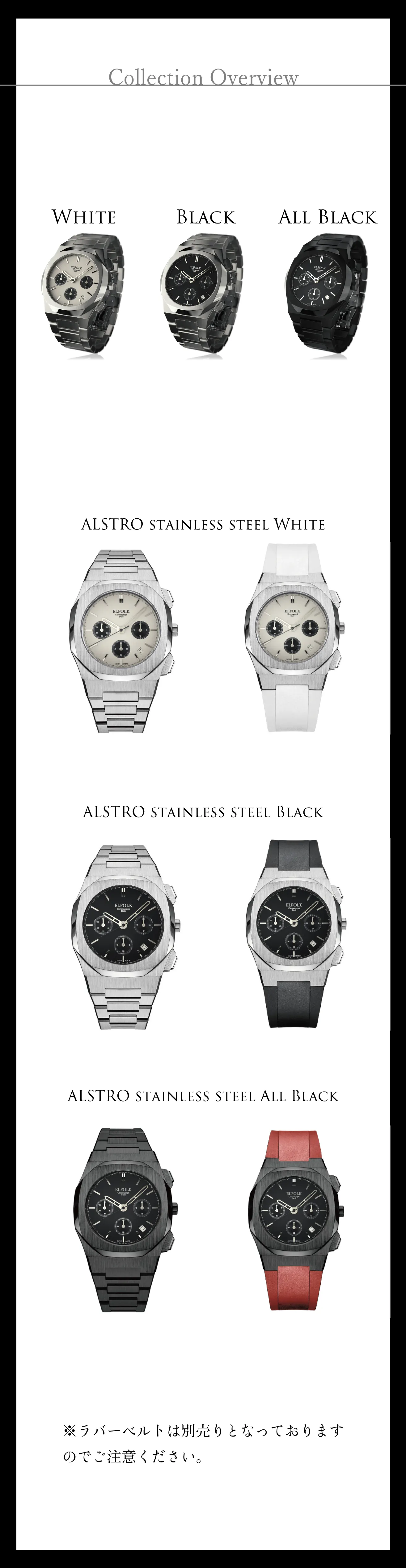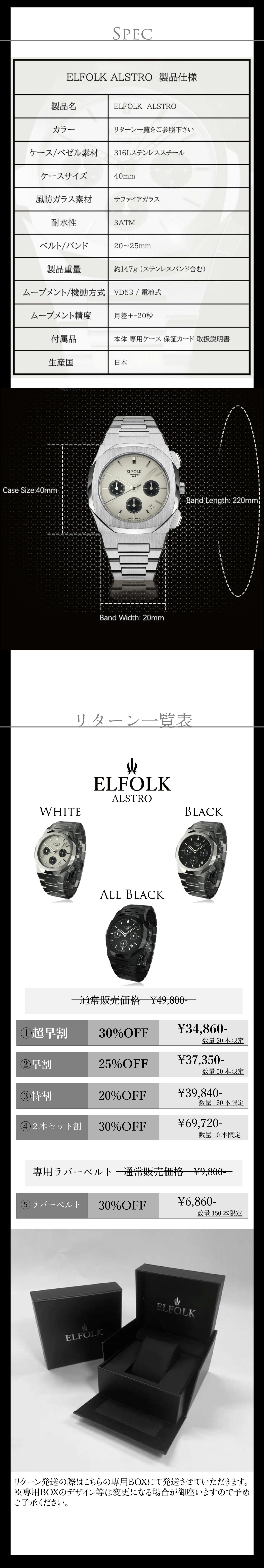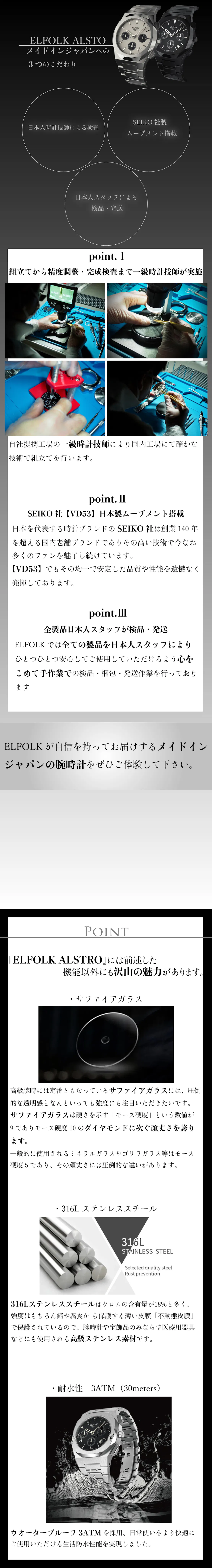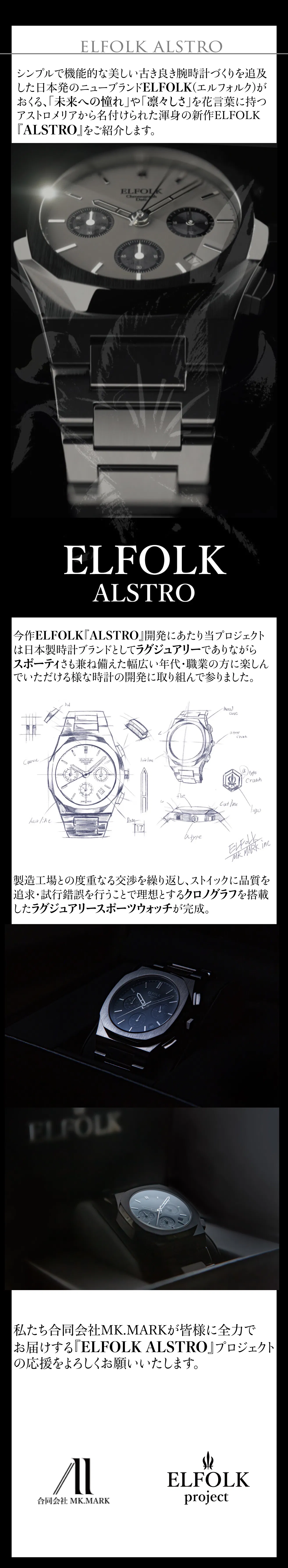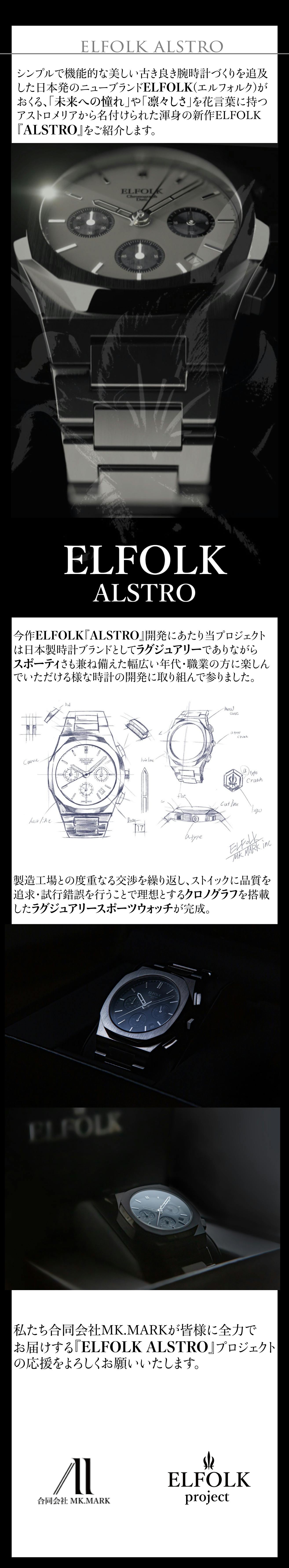 こんな時計があったら良いな、とチーム内で話し合いの中から生まれた腕時計を具現化した製品が当プロジェクト製品第一作目の【ELFOLK Lillie】という作品を生み出し、サポーター様の使用感や望む機能を伺い、試行錯誤の末完成したのが今作【ELFOLK ALSTRO】になります。