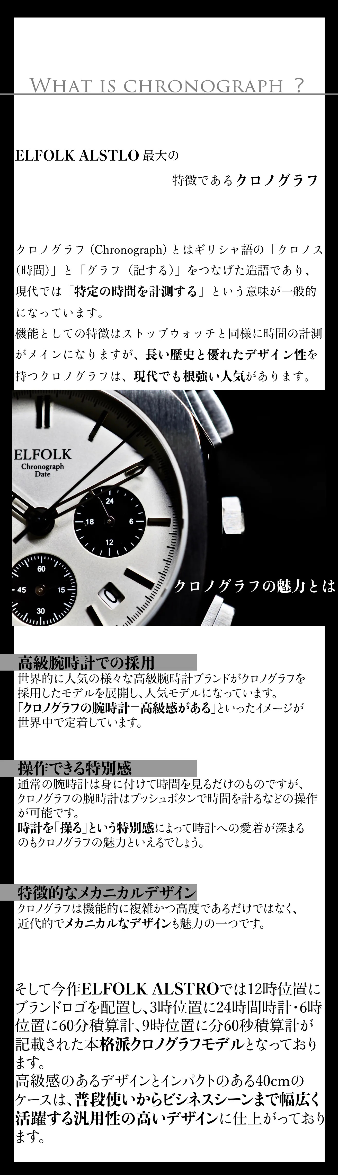 クロノグラフという伝統ある機能を最大限活かしその中にもELFOLKらしさを出し融合させることにチーム一丸となり取り組みました。