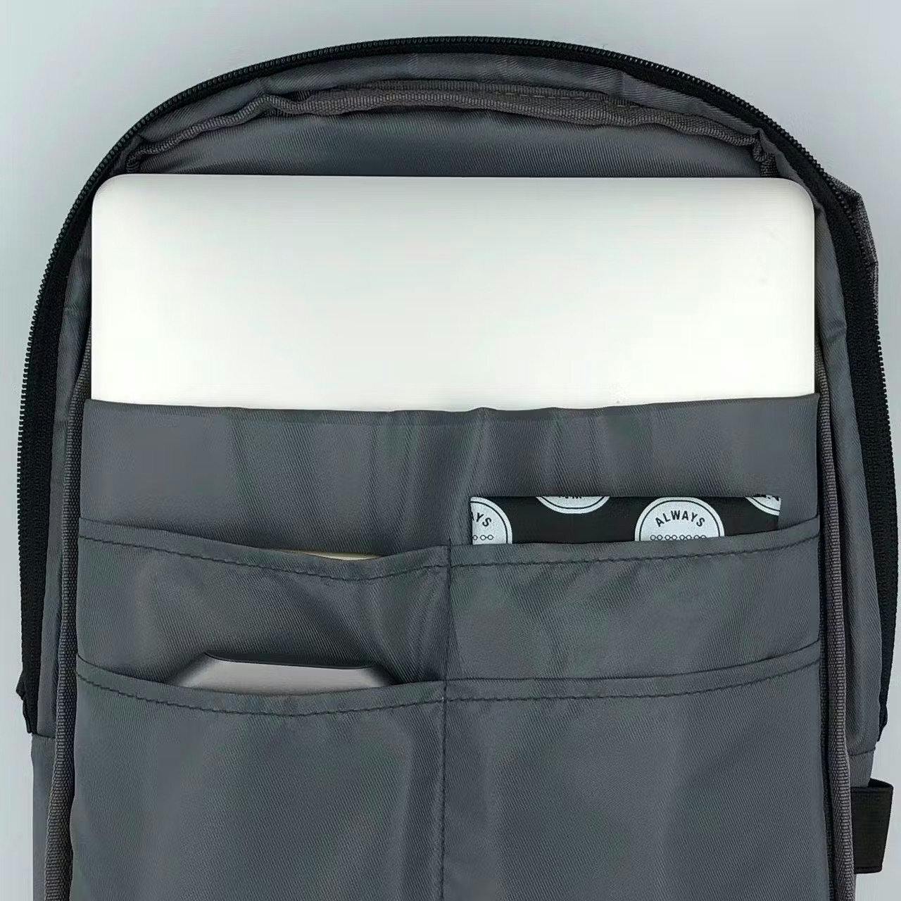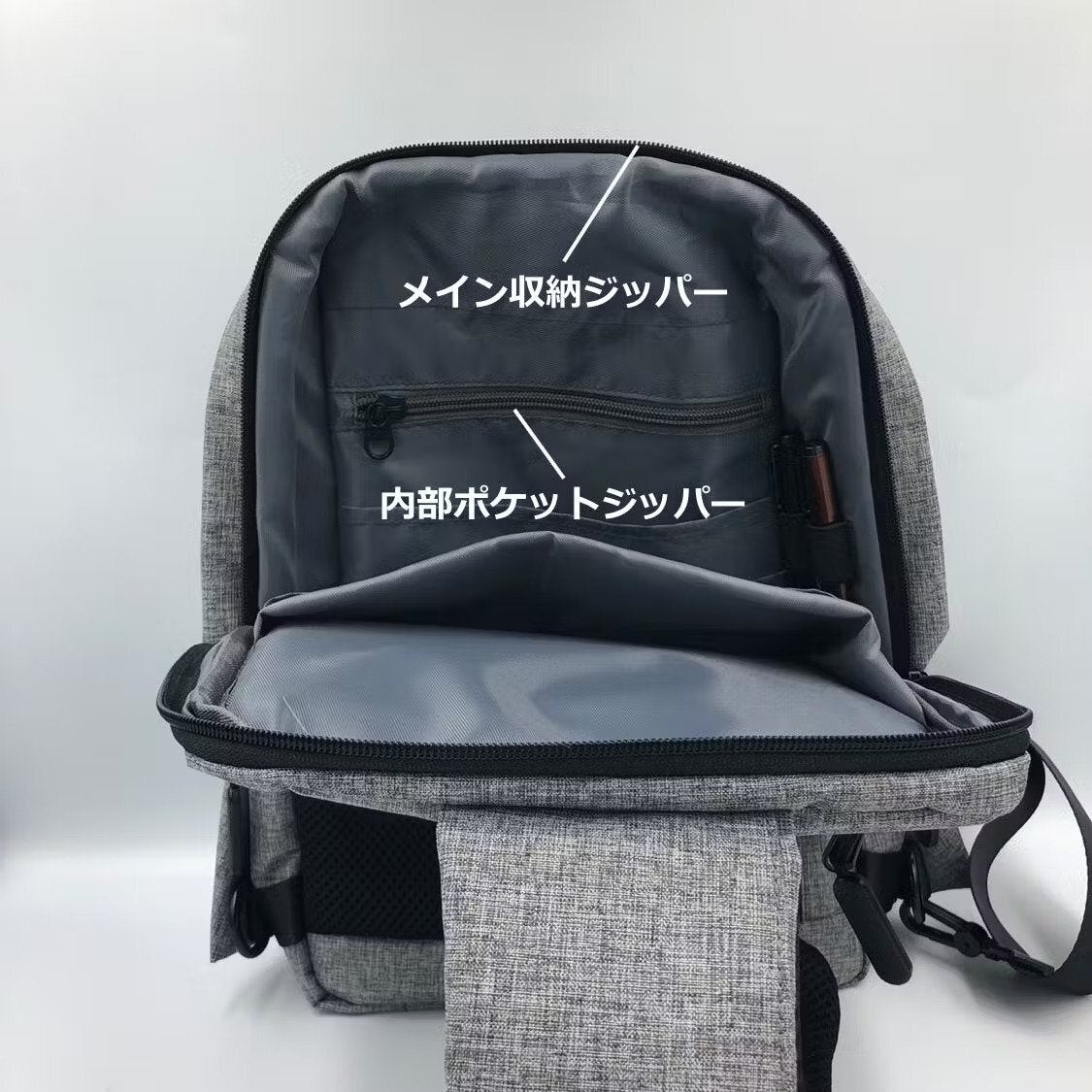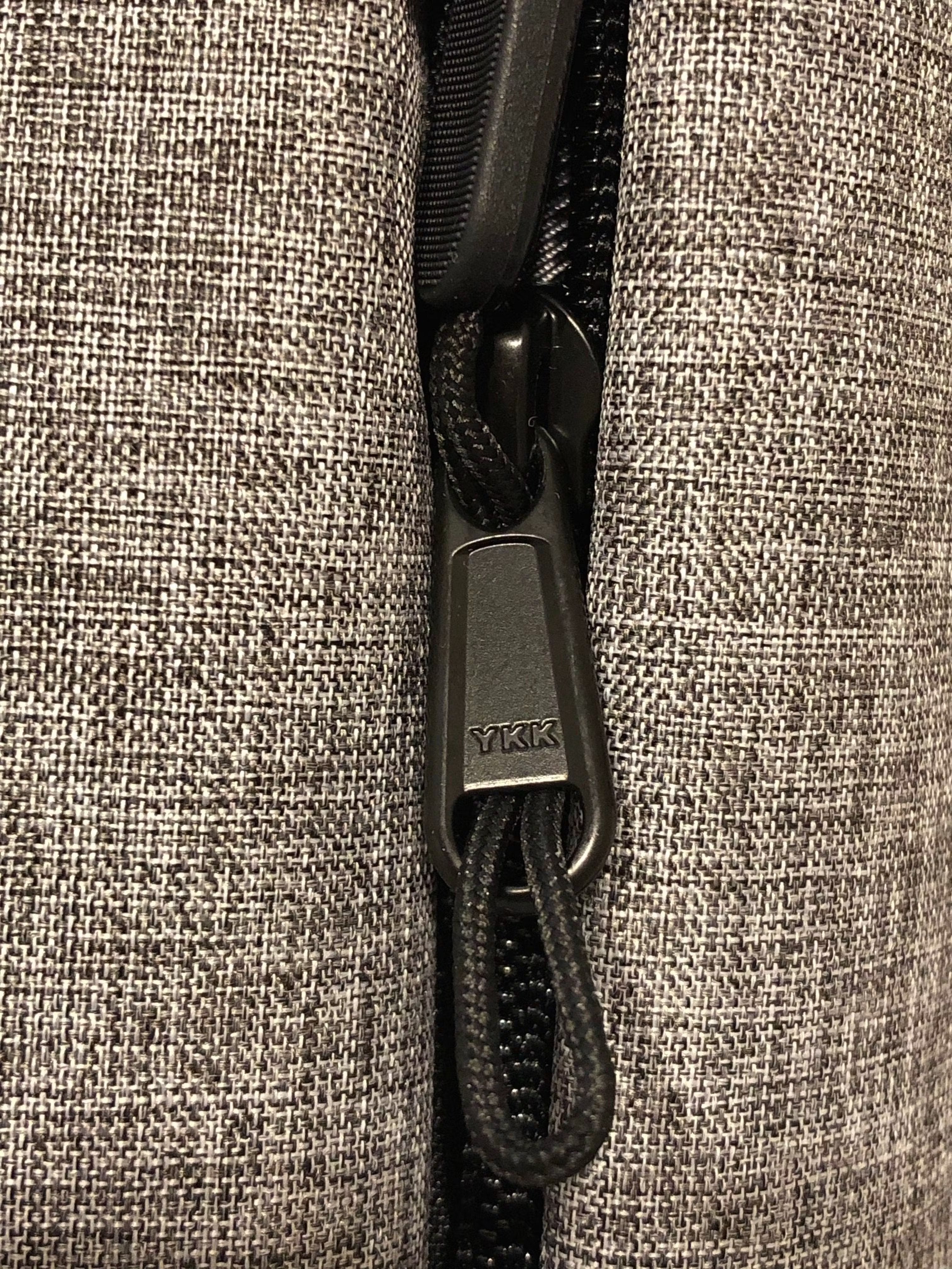 メイン収納、フロントポケット、バックポケット、内部ポケット、すべてYKKです。