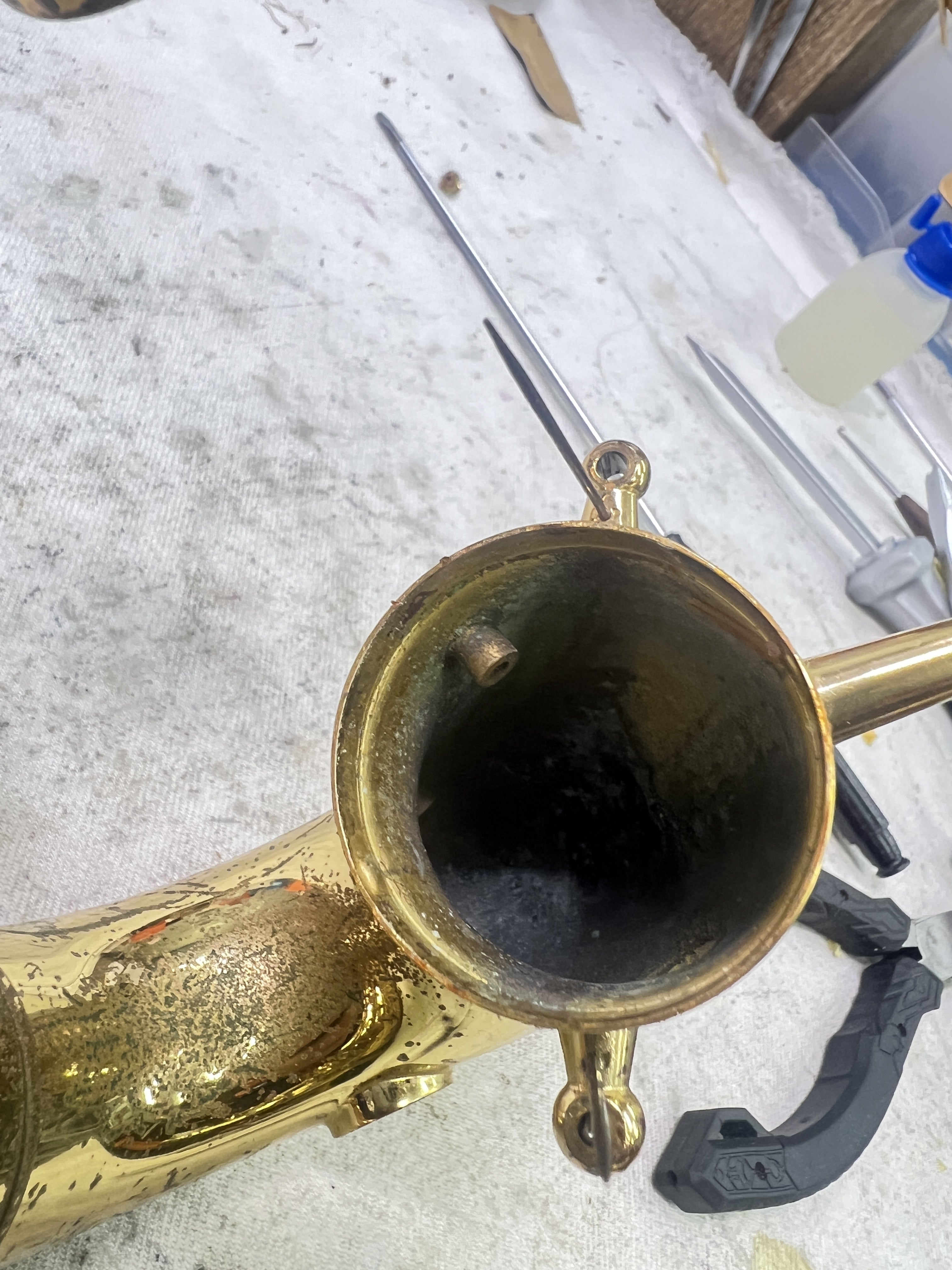 ↑腐食、サビ、汚れの付着したバリトンサックスの管内