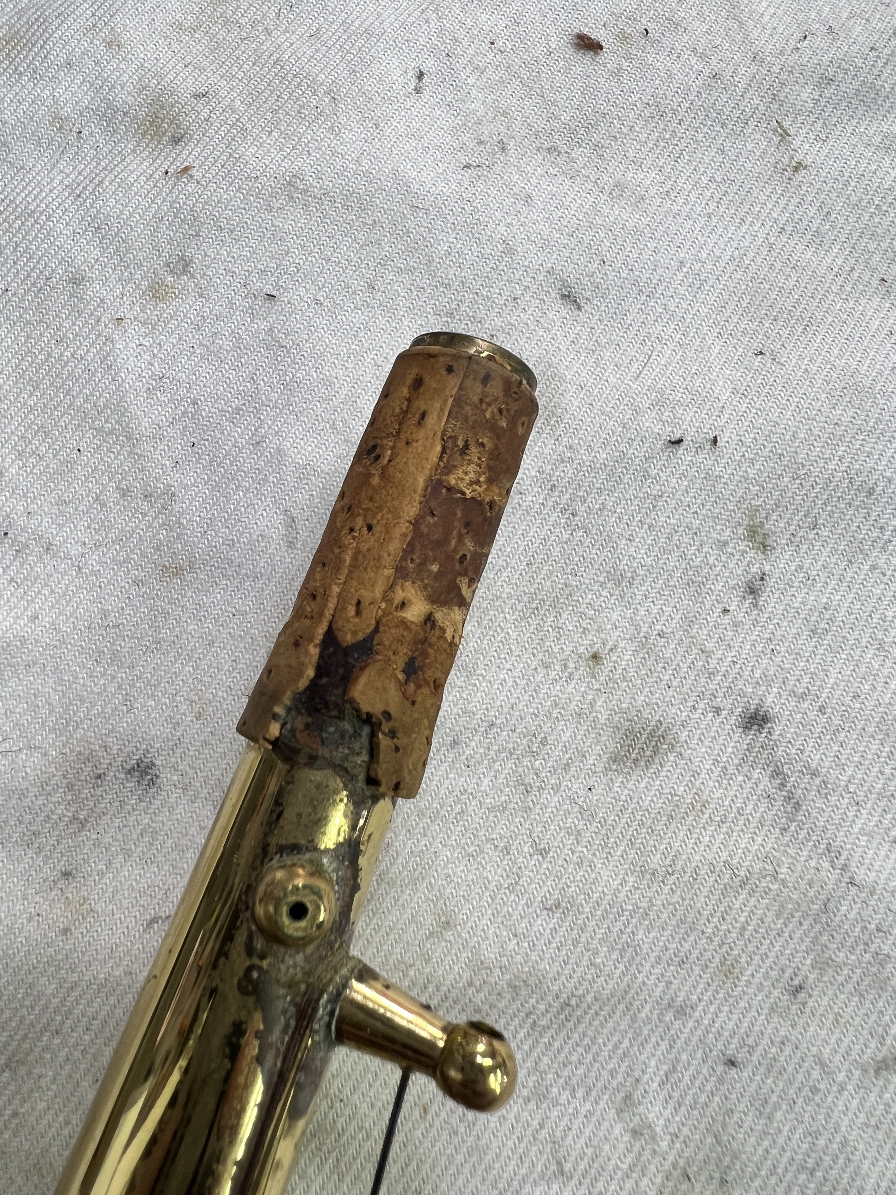 ↑経年により砕けているソプラノサックスのネックコルク(吹き口を取り付けるための個所)
