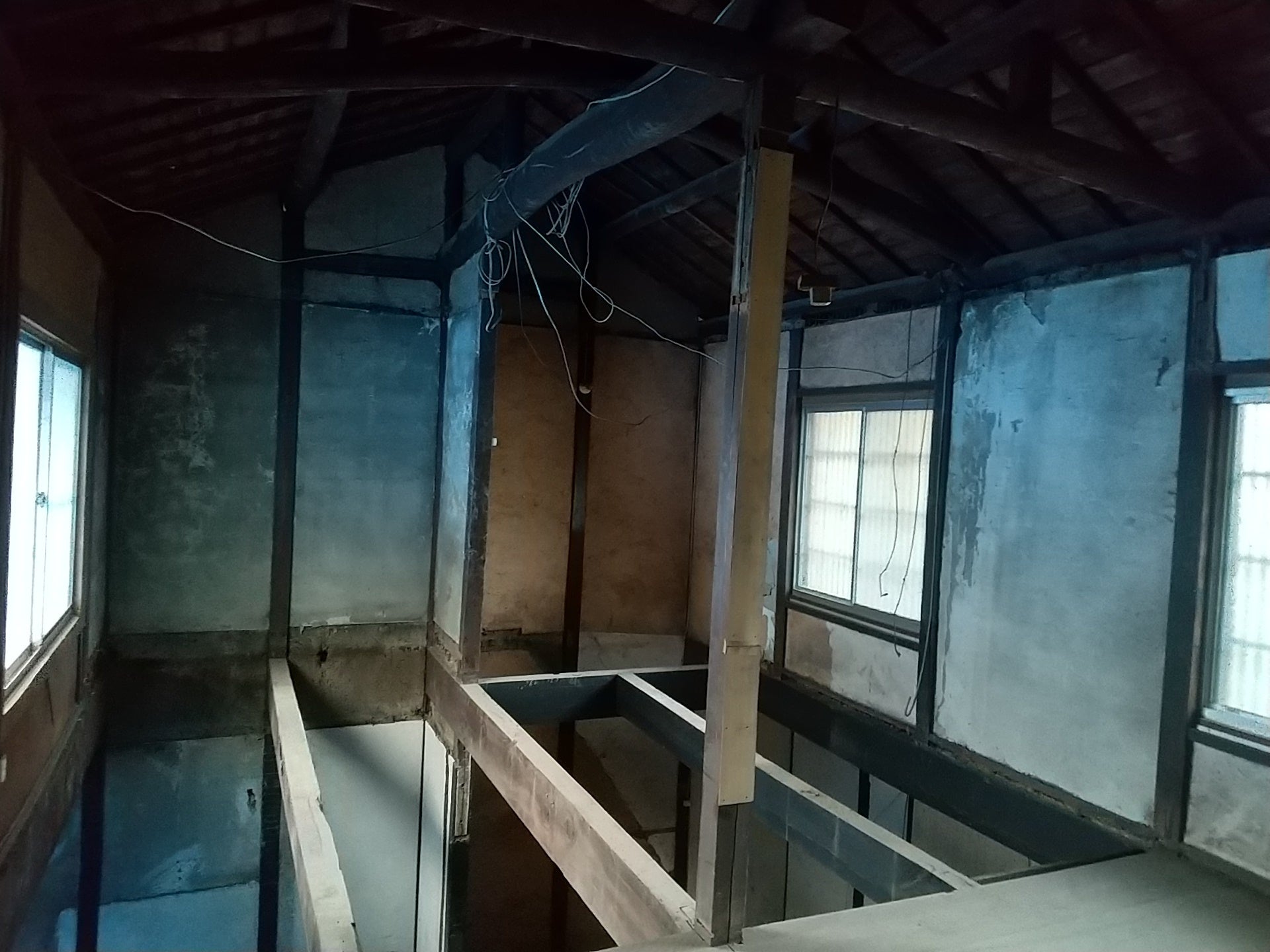 1913年築の家屋、つまり110年経っていたためものすごくいろいろ撤去して全体像がみえてきました。。。。。昔の日本家屋、梁はしっかりしています。ゆがんだ2階の床をとりのぞき、吹き抜けになりました。ここを猫が歩くキャットウォークにしてもらいます!!