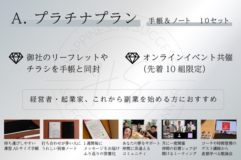 オリジナル手帳を持つ仲間と一緒に夢を叶える1年間のコミュニティに参加できるスタンダードプランです。