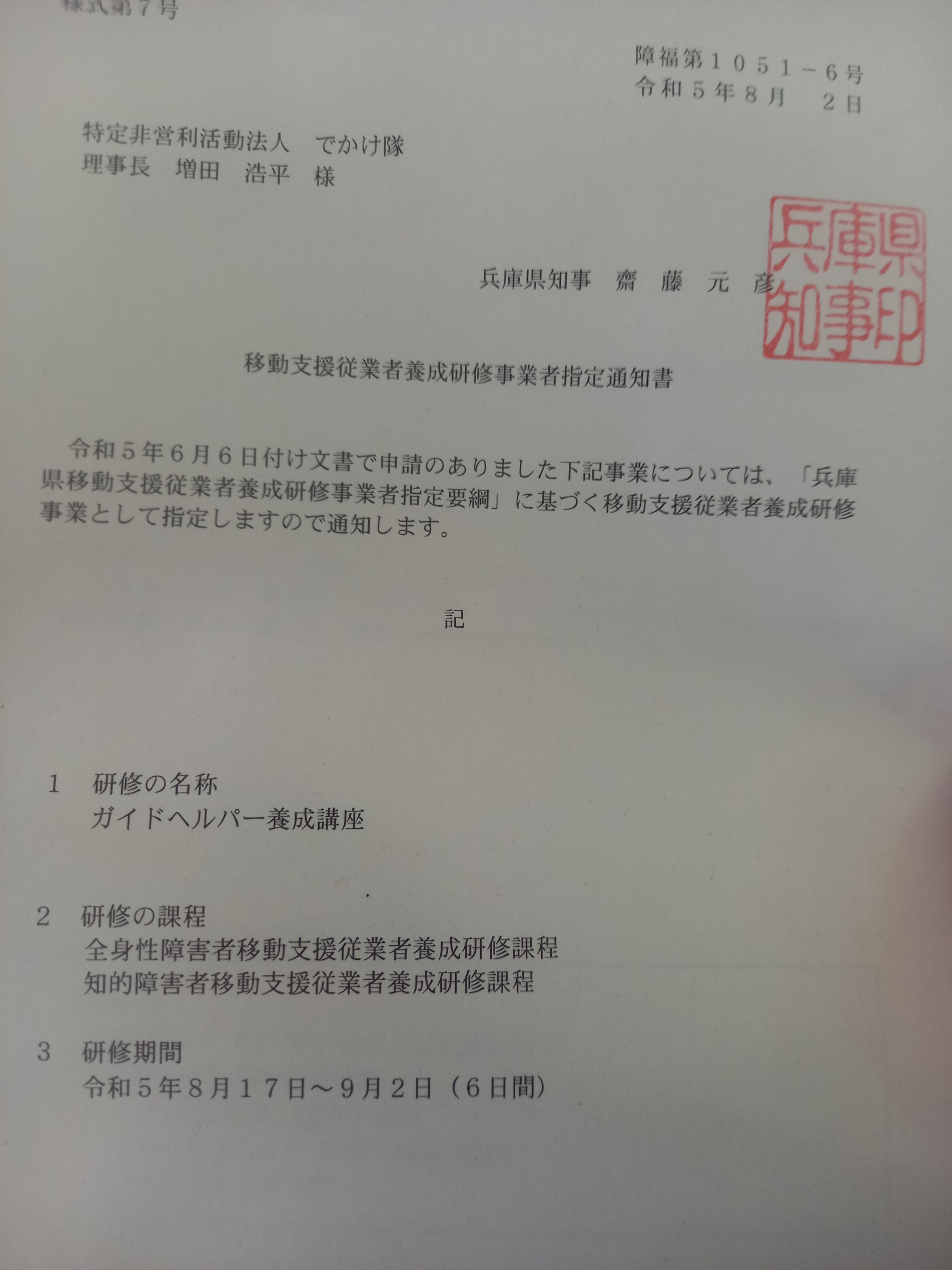 兵庫県より移動支援従事者養成研修事業者の指定通知が届きました!