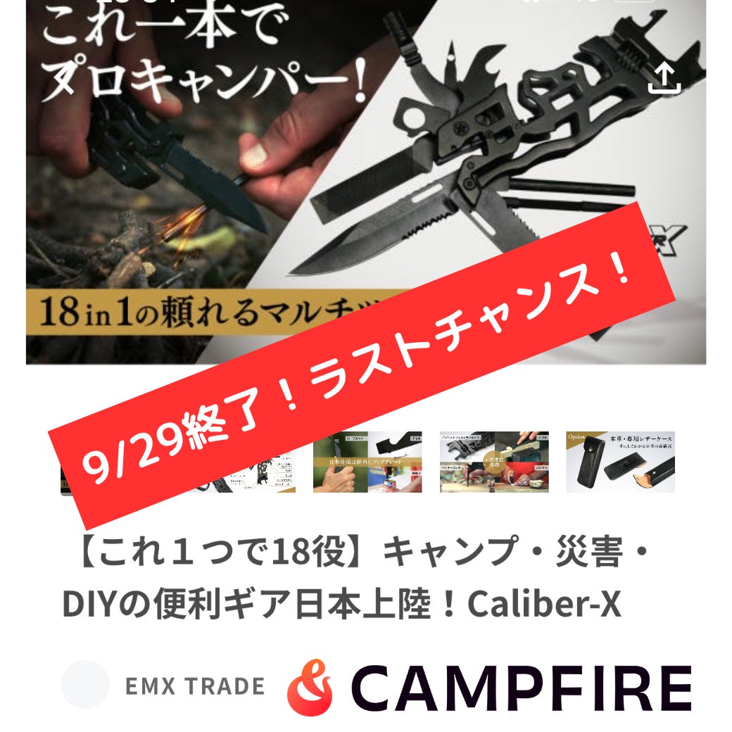 こんばんは!EMX TRADEです!【これ1つで18役】キャンプ・災害・DIYの便利ギア日本上陸!Caliber-X本キャンペーンもまもなく終了となります!お得な最大割引で購入できるのラストチャンスですので、気になっている方は是非!