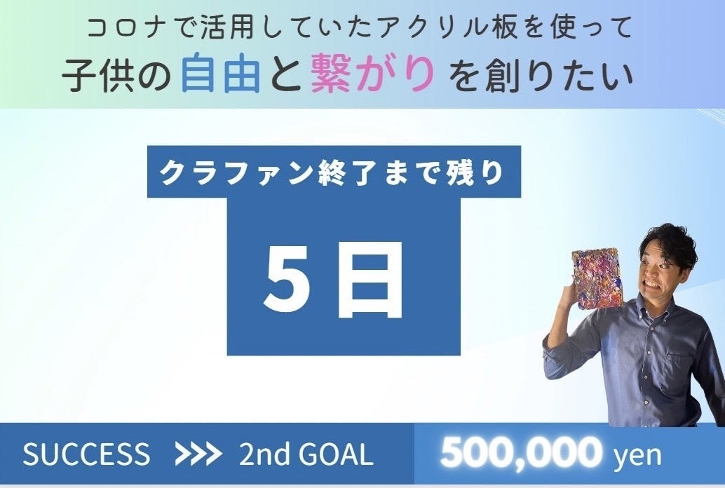 【クラファン残り5日になりました!!】昨日無事に目標だった10万円を達成し、ネクストゴールは50万円を目指します!ご支援応援していただき本当にありがとうございました!!次回個展に関しましては、今回のクラファンで皆様からご支援いただいた支援金を基に実施予定です。ここからさらなるラストスパートに向けて突っ走っていきます!!ふと振り返ってみると、既に22名の皆様からご支援を頂き、こんなにも沢山自分のことを応援してくれる方がいるんだと大変うれしい気持ちでいっぱいいっぱいになっておりますが、改めて感謝をお伝えしたいです。本当にいつも力と勇気と感動をありがとうございます!