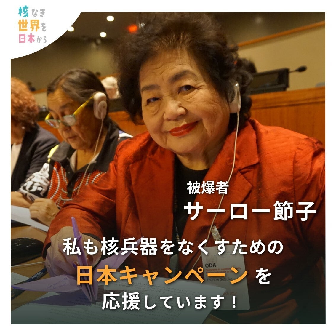 キャンペーンを核兵器禁止条約成立に大きく貢献した被爆者のサーロー節子さんも応援してくださっています。みなさんも仲間になってください!