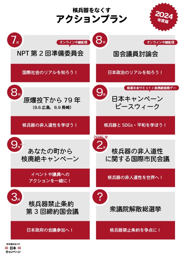 それらを踏まえて、後期(9月〜1月)には、ご自身の関心や各地域・コミュニティの特色にあったアクションを皆さんの足元から日本キャンペーンと一緒に起こし、日本各地で核兵器廃絶への関心を高めていきたいと思っています。