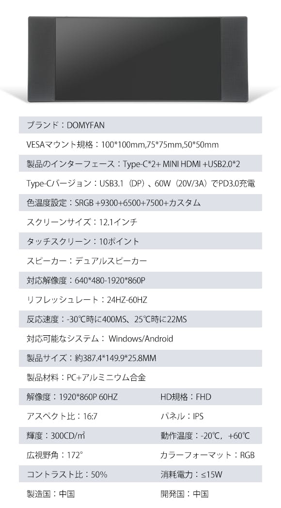 可能性無限大の10ポイントタッチスクリーン「DOMYFAN」【12.1インチ・フルHD相当1920*860P@60HZ・アスペクト比16:7・全視野角172°・デュアルスピーカー搭載】