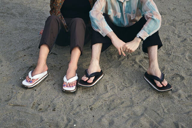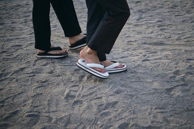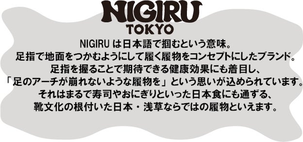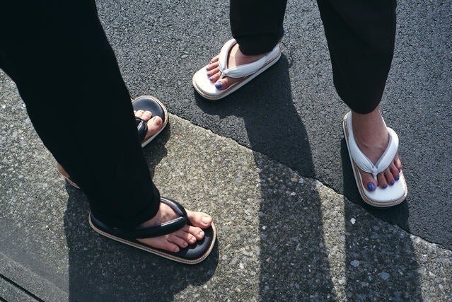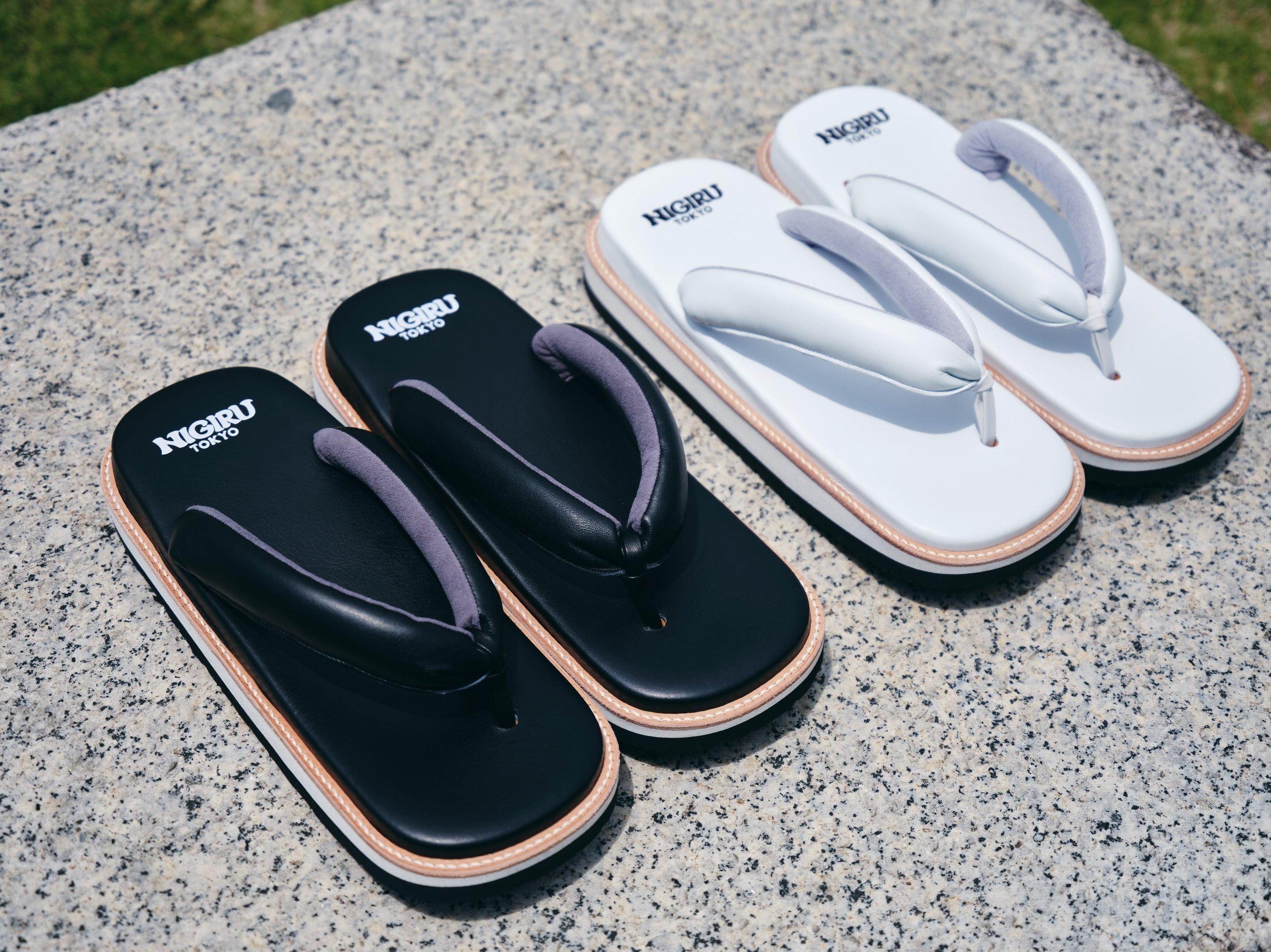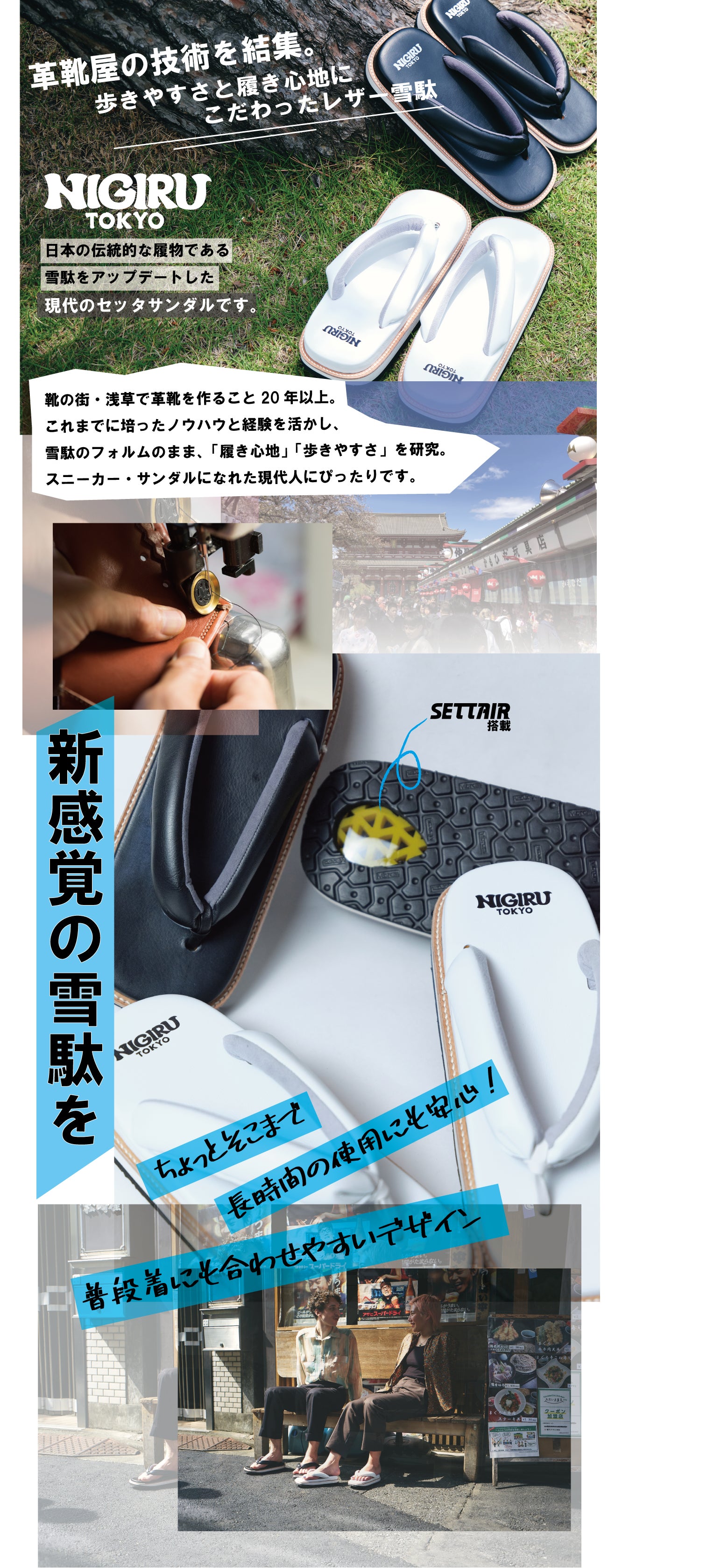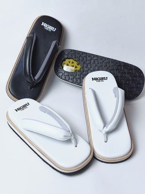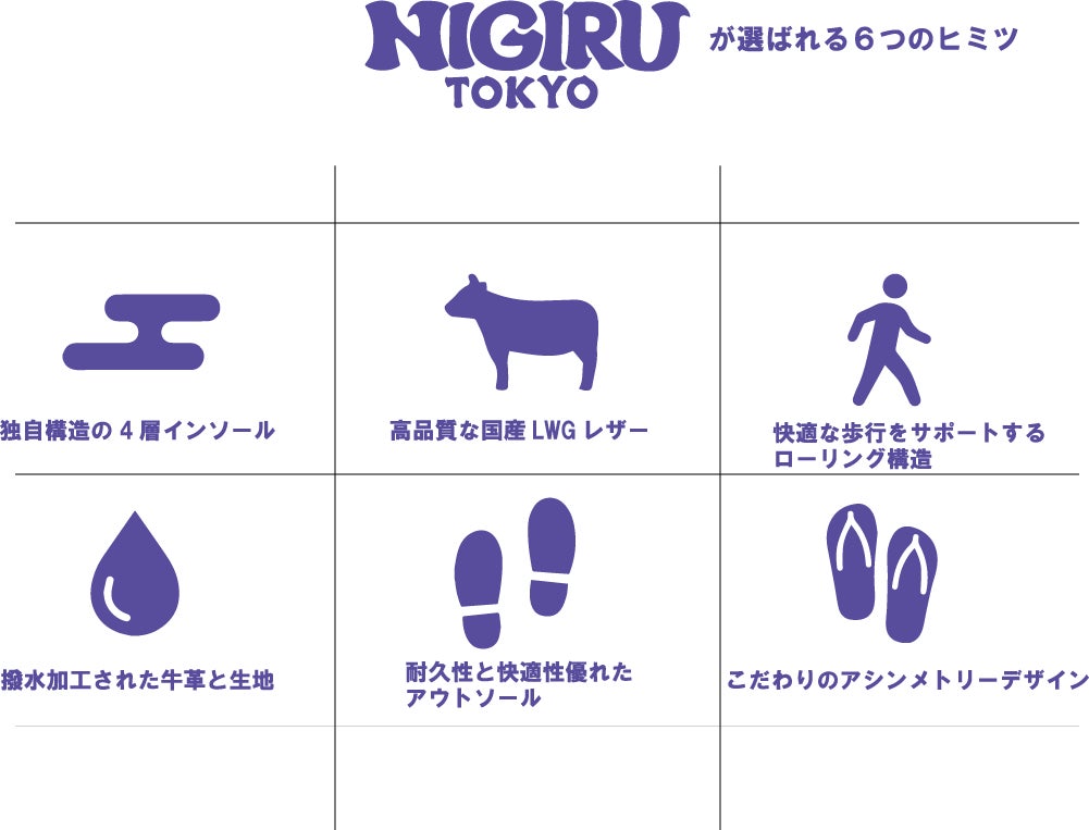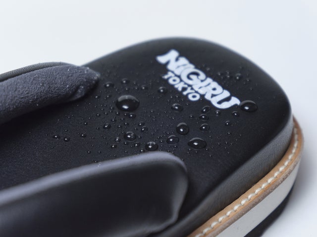 NIGIRUに使われている牛革と鼻緒裏の生地は撥水加工されており、どんな天候でも履くことができます。