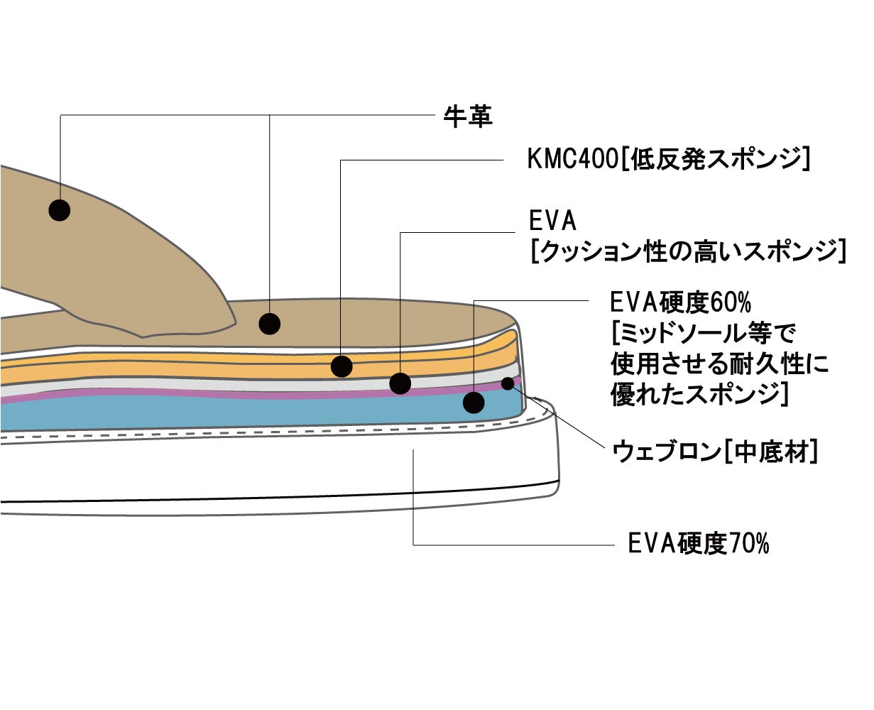 これによって本来の歩行動作を邪魔することなく、まるでスニーカーの様な履き心地になっています。