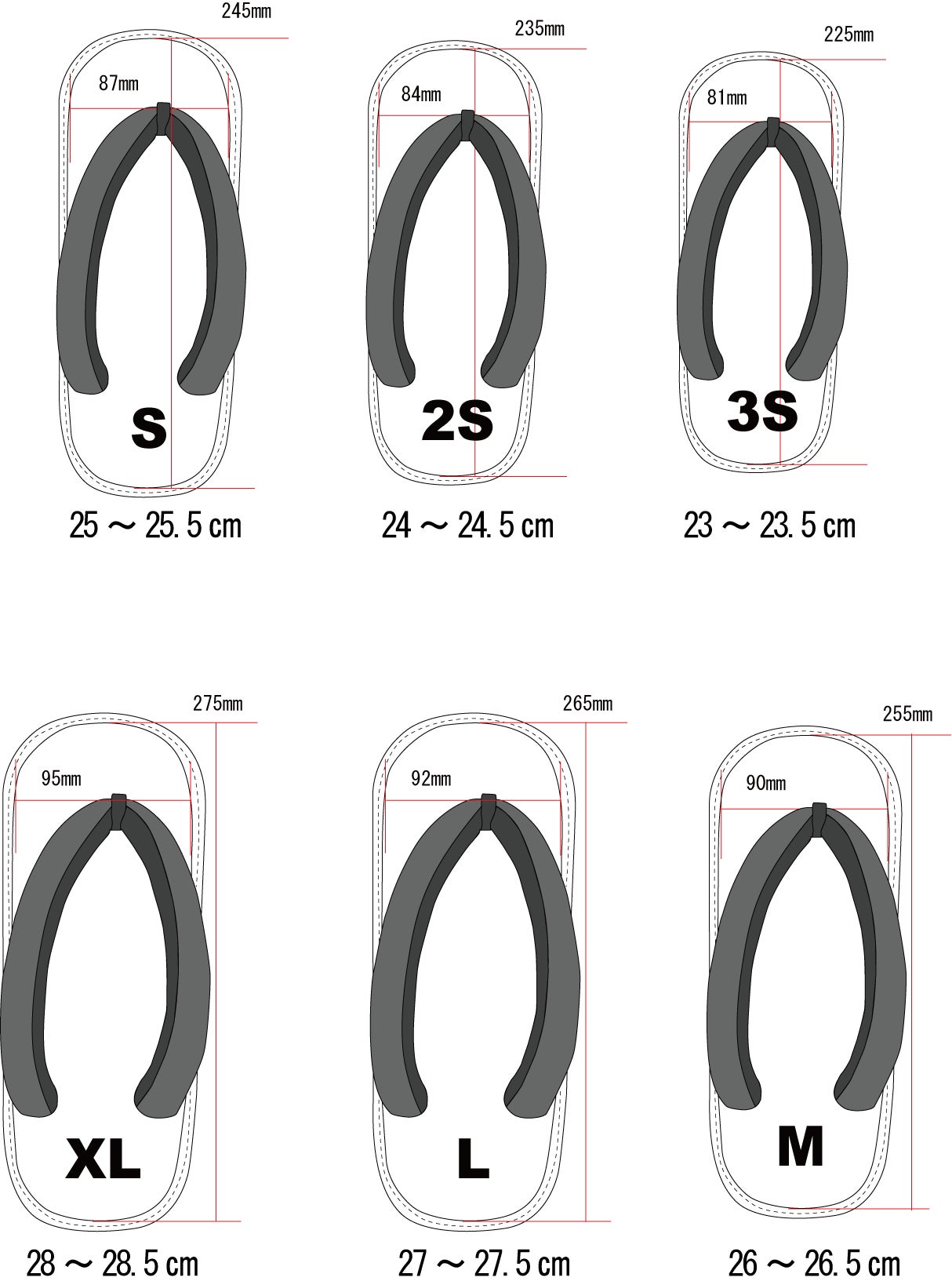 ※実寸でお選びいただいた場合、履き始めは鼻緒がご着用者様の足に馴染みきっておらず、踵が少しはみ出る場合がございます。ですが、ご着用を続けていただくことで鼻緒が馴染み、より足が前まで入って天板に足に納まるようになります。